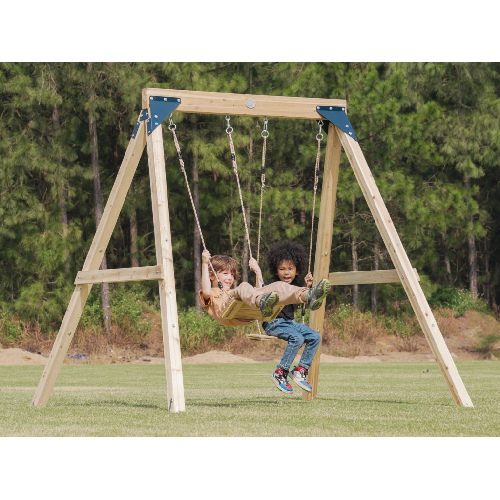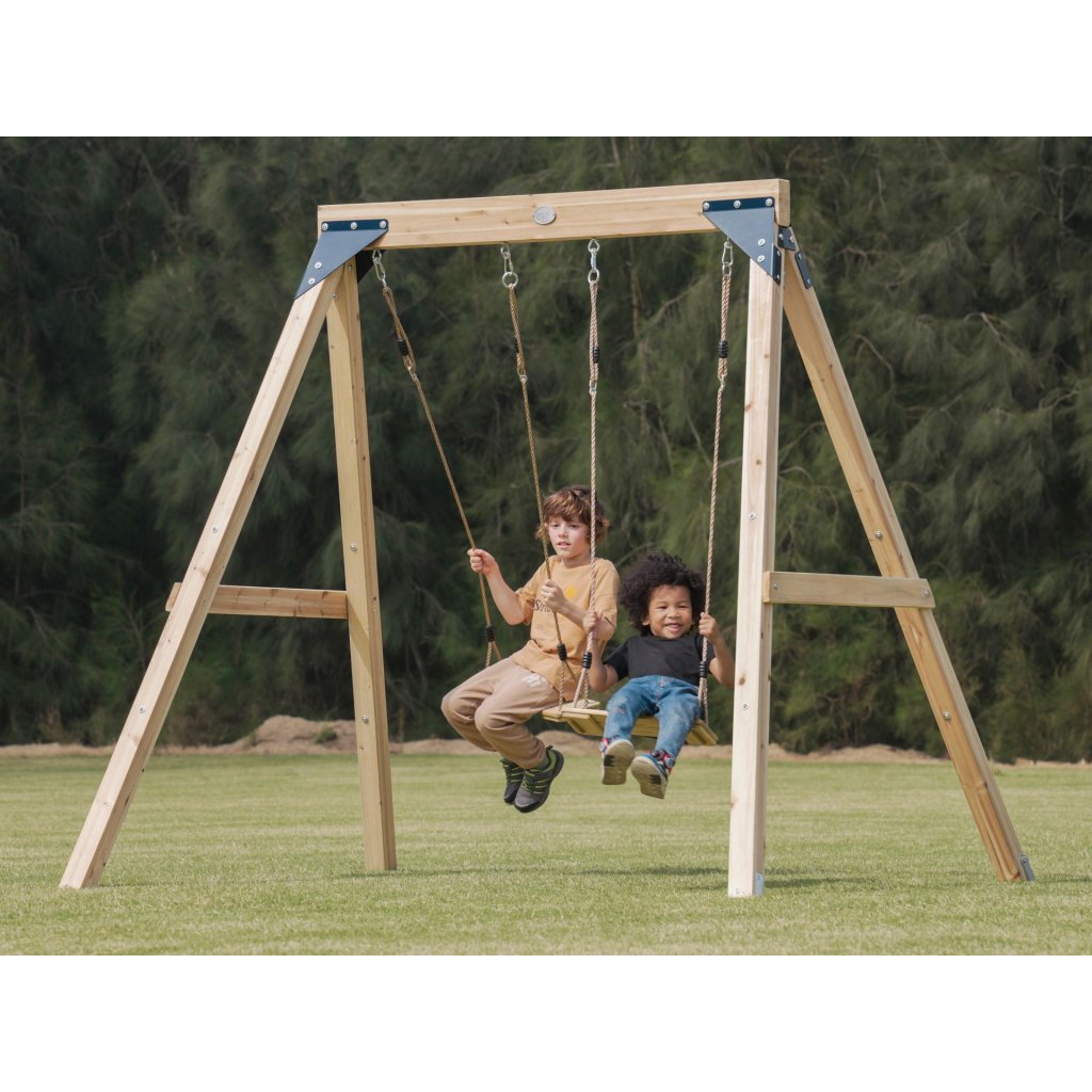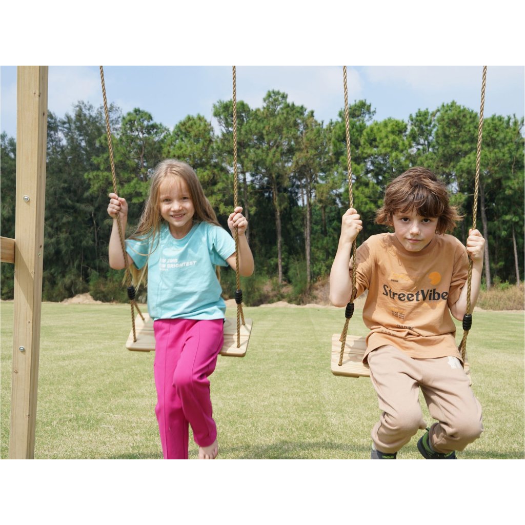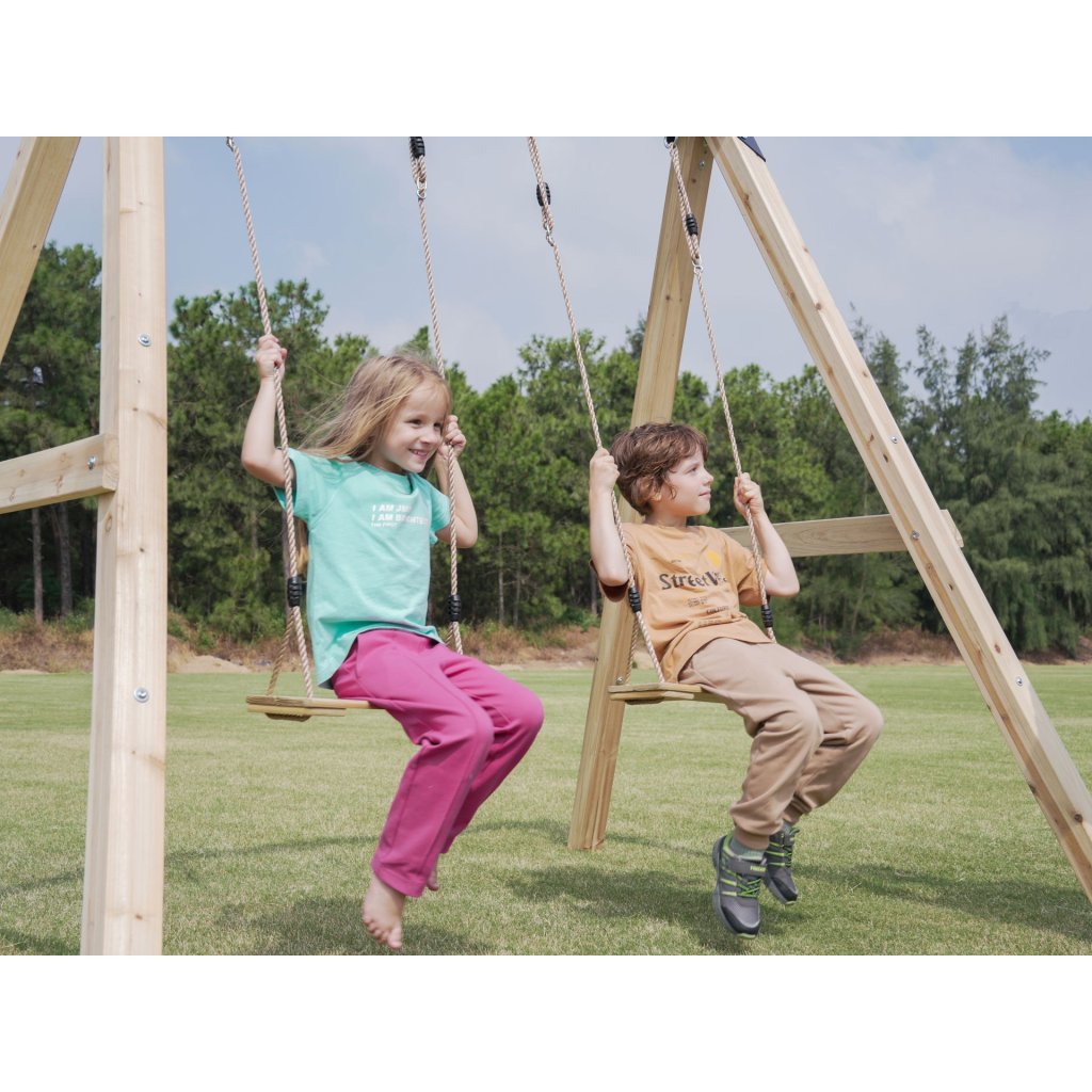 Dvojitá dřevěná houpačka Yuna je ideální volbou pro všechny zahrady, kde chtějí rodiče dětem dopřát bezpečnou a zábavnou venkovní aktivitu. Tato houpačková sestava nabízí dvě pohodlné houpačky, která umožňují houpání dvou dětí současně. Houpačka podporuje rozvoj rovnováhy, koordinace, síly a obratnosti, a zároveň poskytuje hodiny zábavy na čerstvém vzduchu.