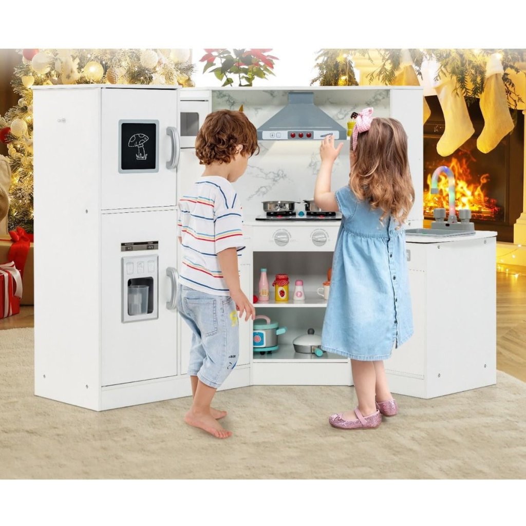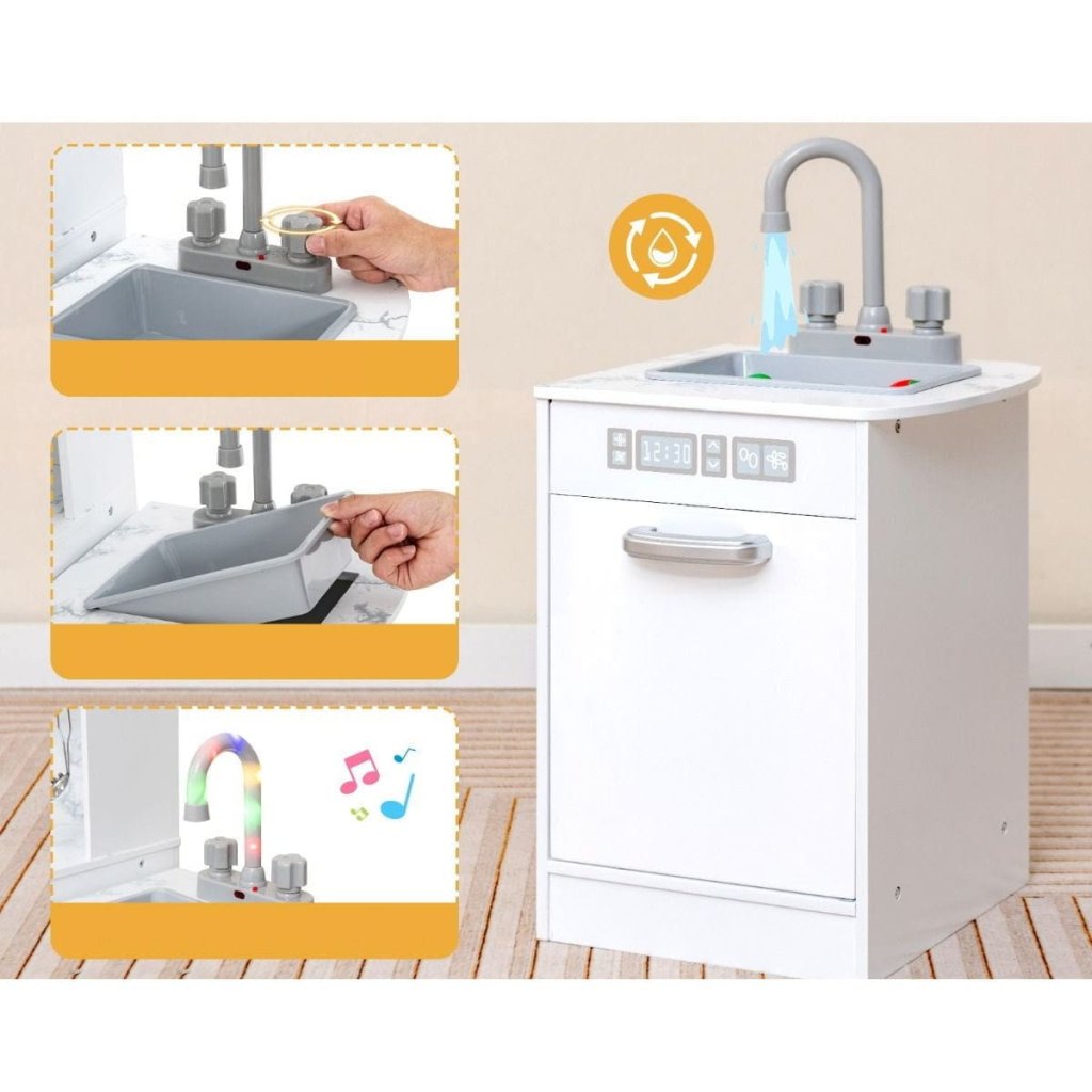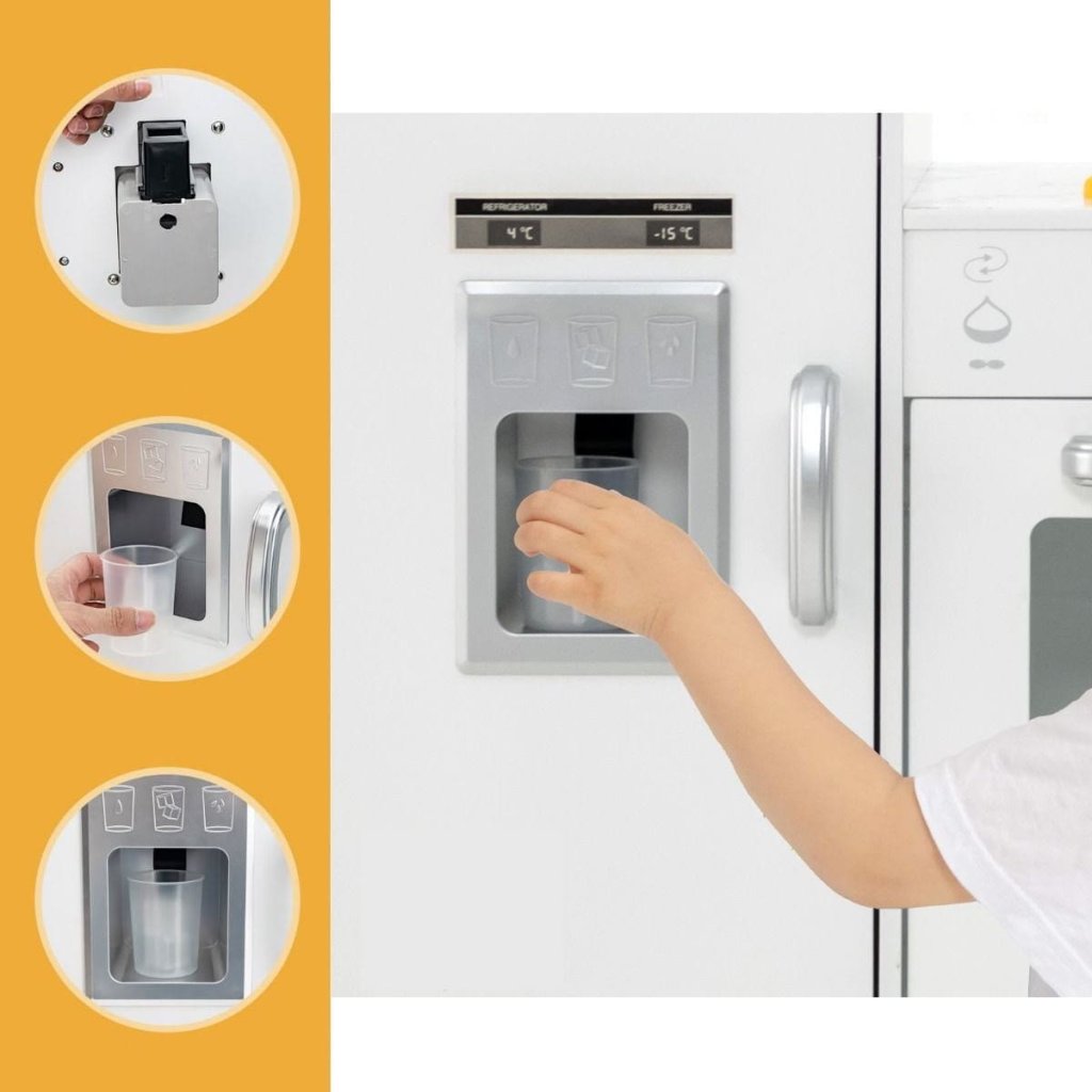 Tato elegantní bílá dětská kuchyňka je ideálním místem pro malé kuchaře, kteří chtějí napodobit vaření a přípravu jídel jako dospělí.