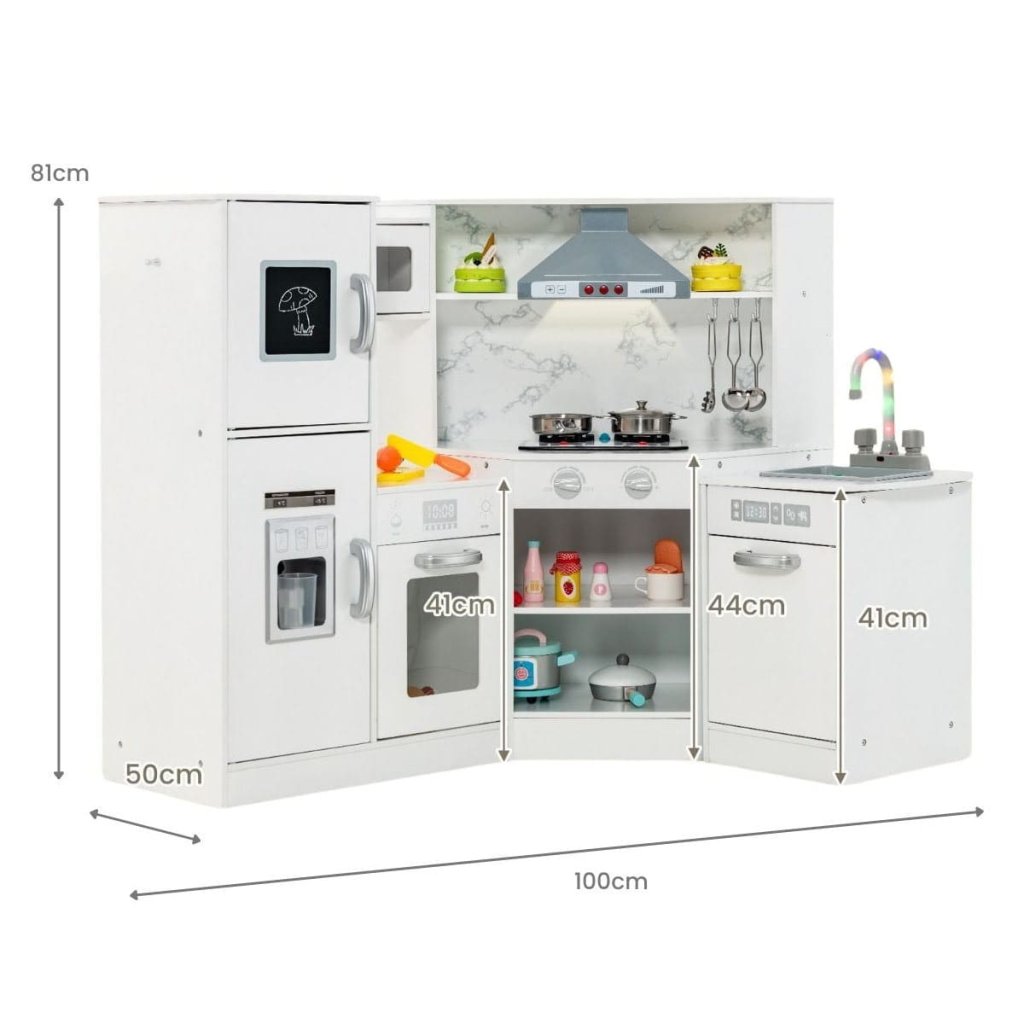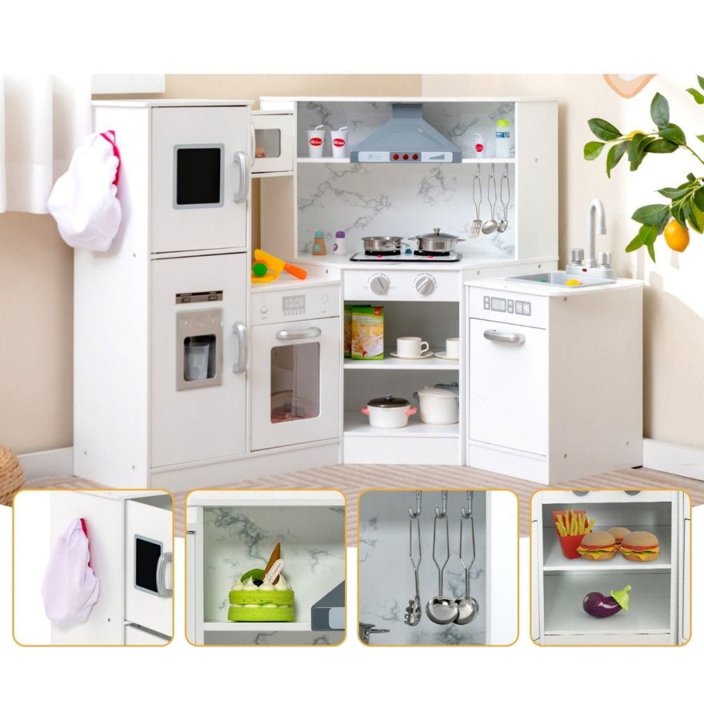 Kuchyňka je vybavena detailními prvky, jako jsou otevírací trouba, lednice, dřez s kohoutkem, varná deska a úložné prostory, které podporují dětskou představivost a rozvíjejí motoriku.