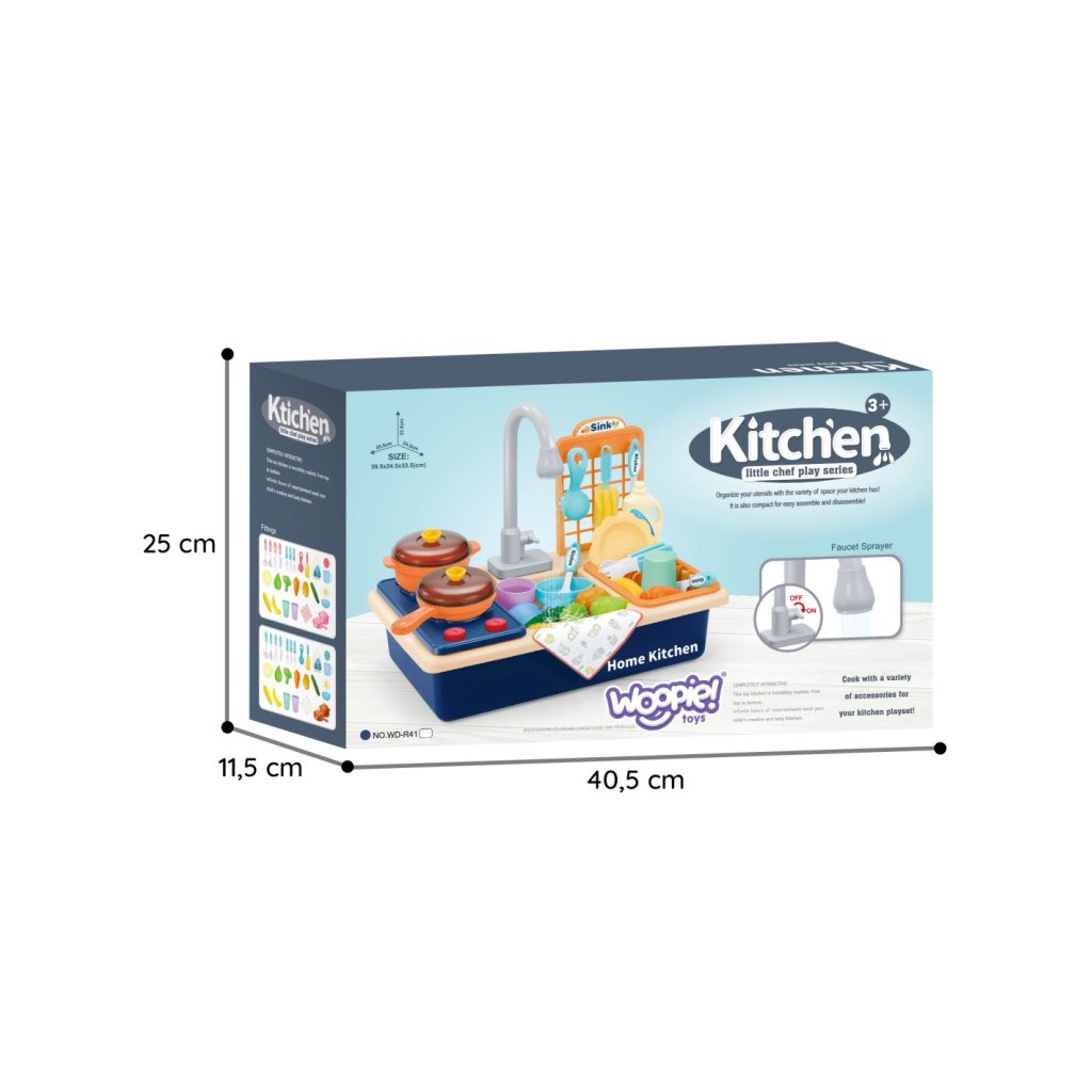 Součástí sady je bohaté příslušenství, například talíře, hrníčky, příbory, hrnce nebo potraviny. Díky tomu si děti mohou vytvářet vlastní kuchyňské scénáře, rozvíjet kreativitu a hrát si samostatně i s ostatními. Praktické provedení navíc umožňuje ukládání jednotlivých dílů přímo do dřezu, což pomáhá udržovat pořádek.