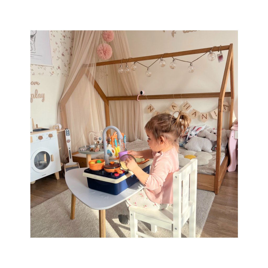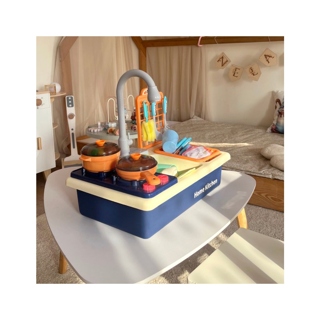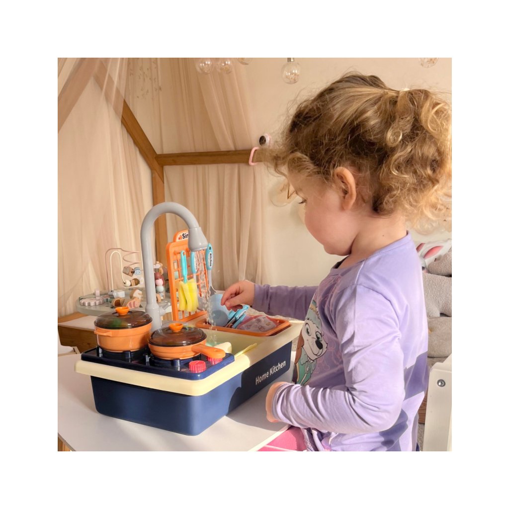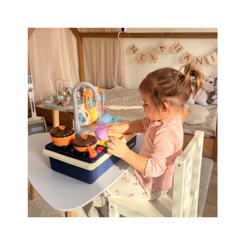 Velkou předností je funkční kohoutek s cirkulací vody, který po naplnění nádržky skutečně teče. Děti tak zažijí realistický pocit z mytí nádobí, což zvyšuje zábavnost a zároveň je motivuje k delší a aktivnější hře.
