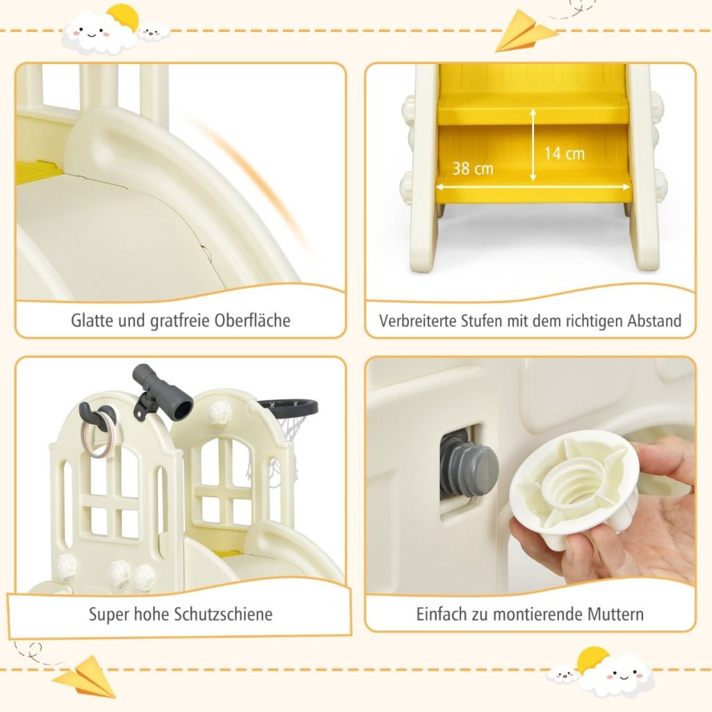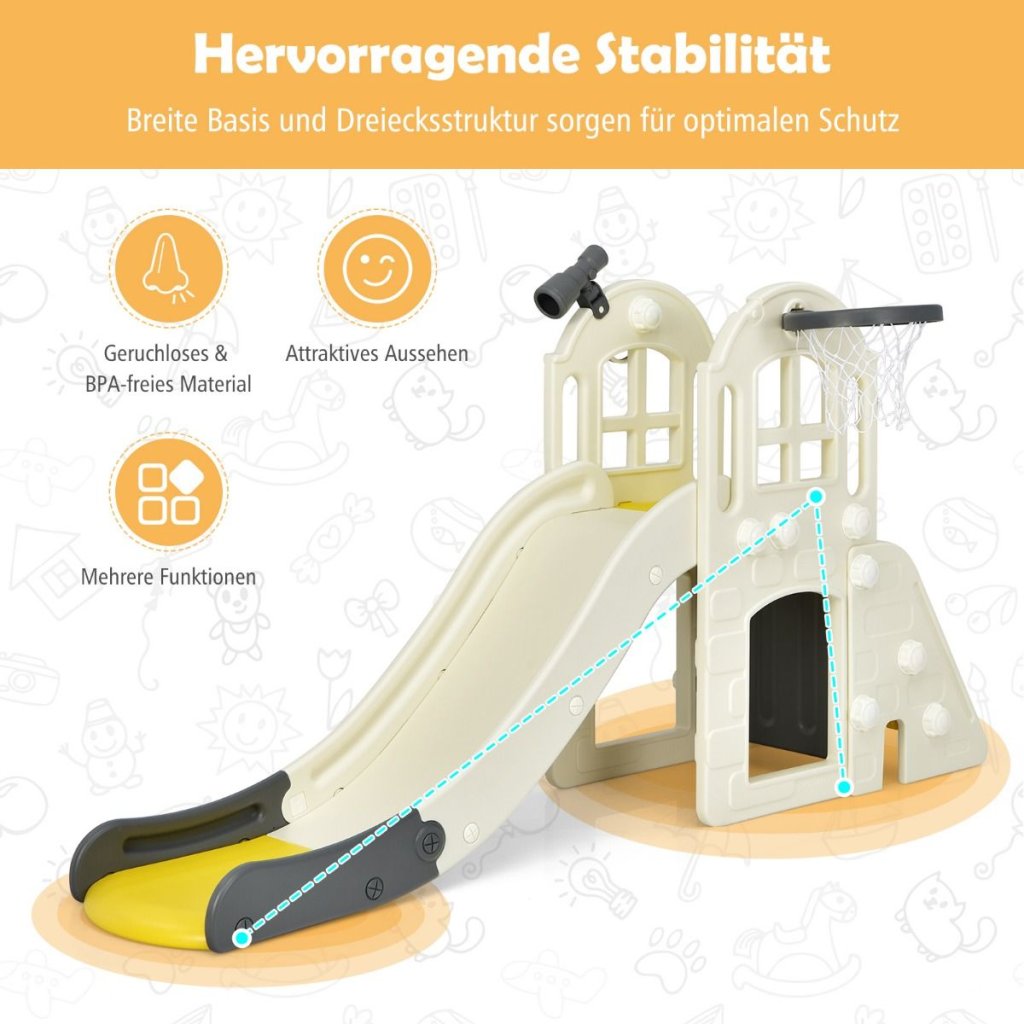 Tato velká herní sada je vybavena 6 zónami aktivit, včetně dlouhé šikmé skluzavky, lezecké stěny, tunelu, basketbalového koše, hodu kruhem a dalekohledu, díky čemuž je sada skluzavky rájem pro děti. Široká a prodloužená skluzavka byla vědecky navržena se zónou zrychlení, zpomalovací zónou a nárazníkovou zónou, aby vaše děti mohly hladce klouzat a bezpečně přistávat. Zesílená madla na obou stranách navíc zvyšují dodatečnou bezpečnost.