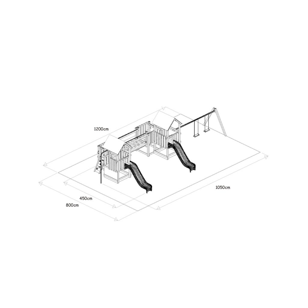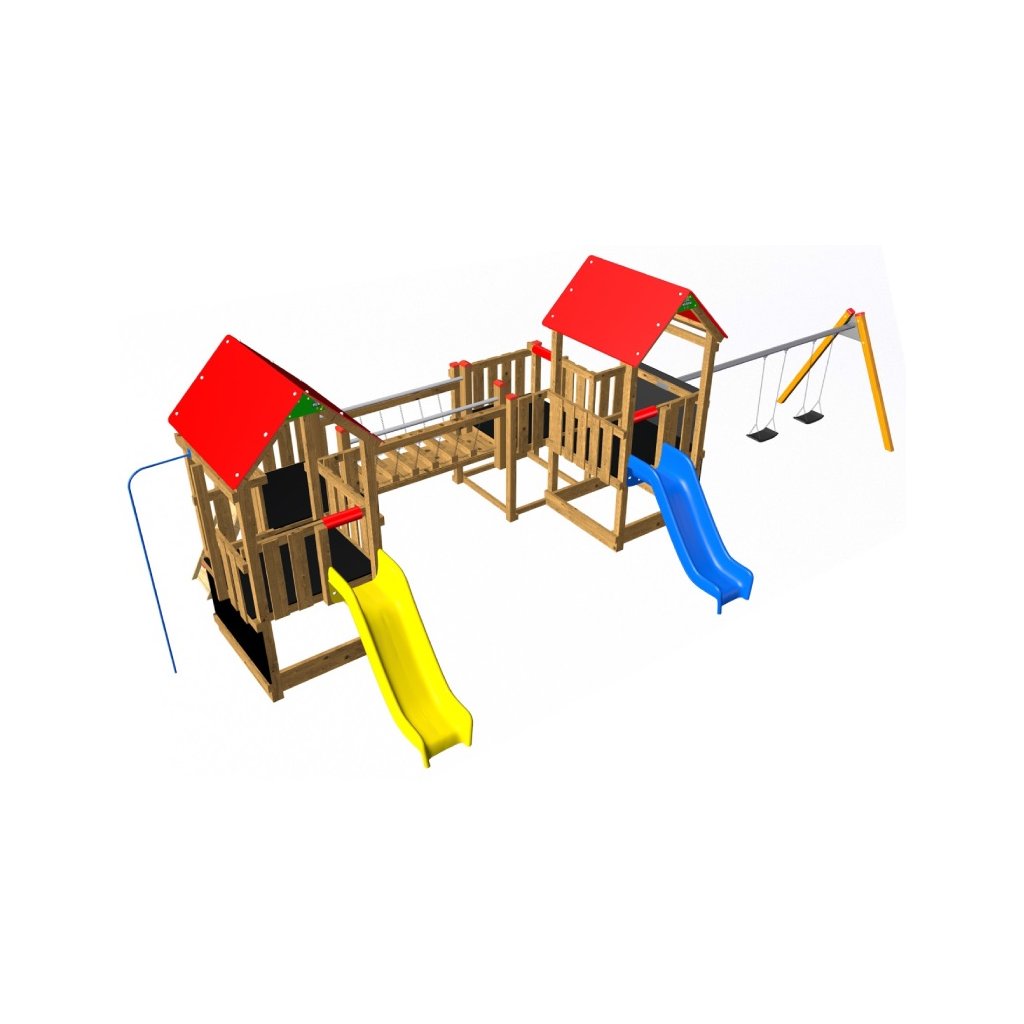 Krásné dětské hřiště s dvěma skluzavkami a dvojhoupačkou, vhodné například pro mateřské školy, obce a restaurace, velmi dobře podpoří pohybovou aktivitu dětí.
