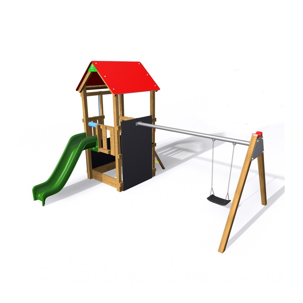 Sestava Flexi věž 100 TH1 - střecha premium se skládá z 1 věže, 1 nástupního žebříku nebo lezecí stěny - dle vašeho výběru. Herní sestava je doplněna tabulí na malování a požární tyčí k sestavě je připojen houpačkový modul s jedním certifikovaným houpačkovým sedákem (sedák je s ocelovou výztuží a zavěšený na zinkovaných řetězech). Za příplatek vám houpačkový sedák vyměníme za houpačkový sedák pro nejmenší děti. Houpačka je v sníženém provedení a proto zde není třeba vytvářet dopadové plochy.
