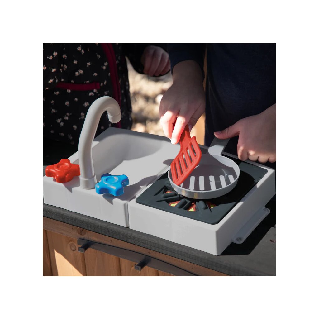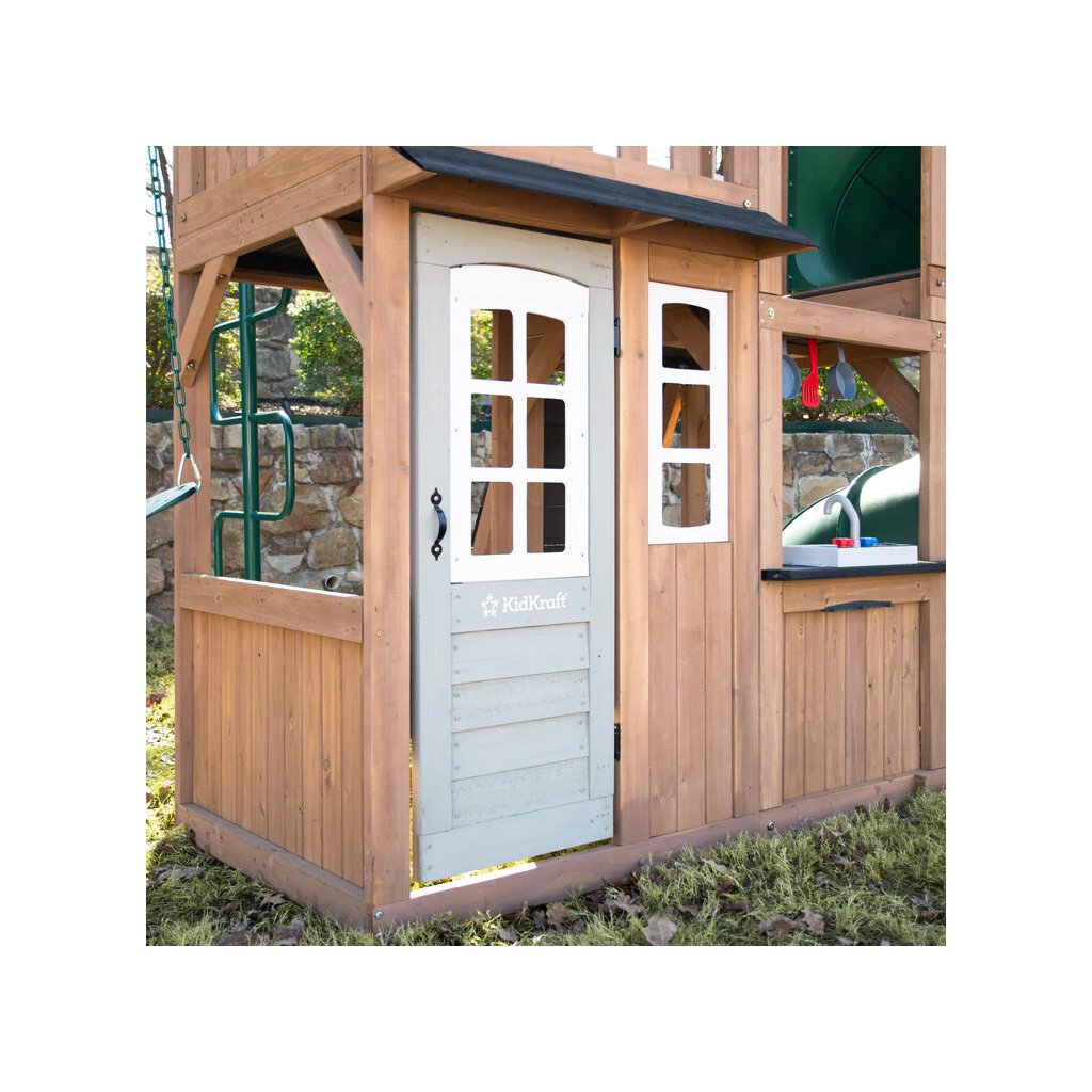 Spodní část herní věže je řešena jako integrovaný domeček s kuchyňkou, který nabízí prostor pro námětovou a tvořivou hru. Domeček je vybaven dveřmi a okny a vytváří dětem útulné zázemí pro hru na domácnost nebo vaření.