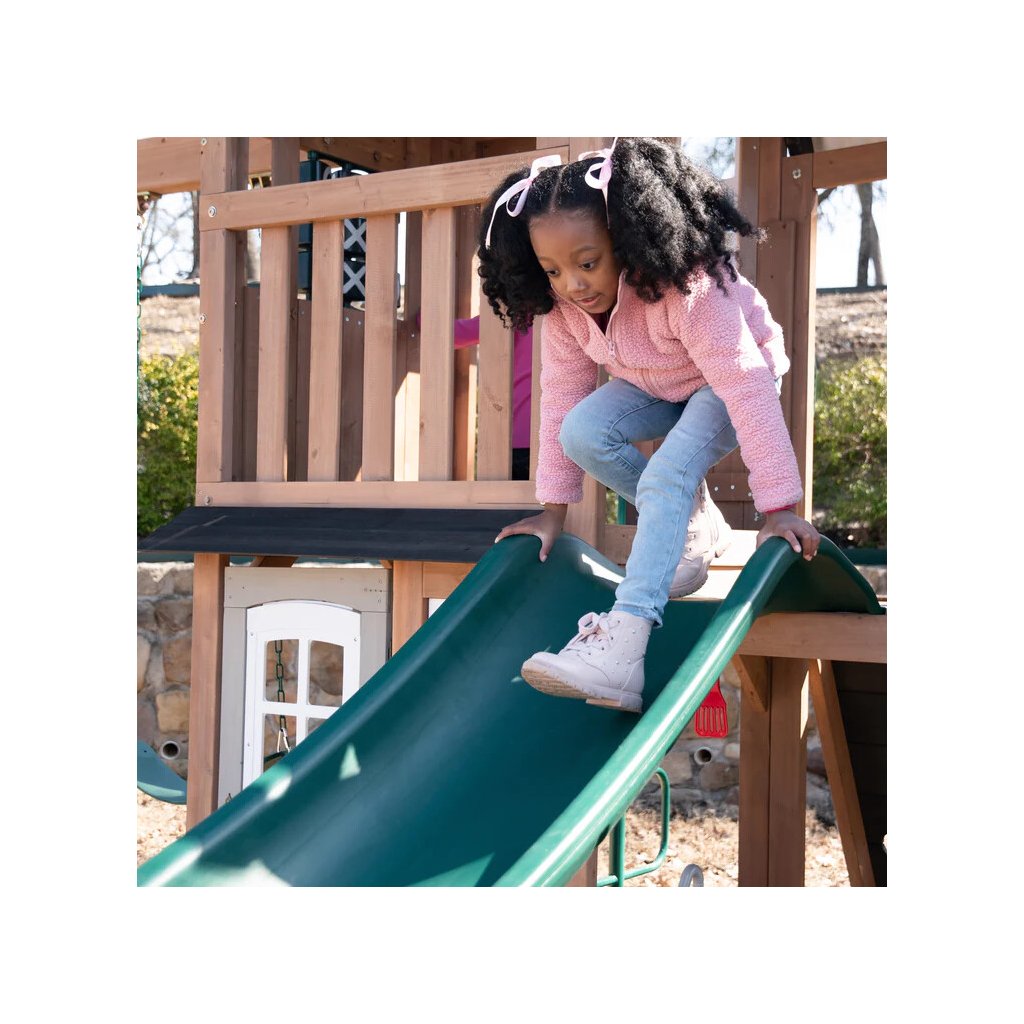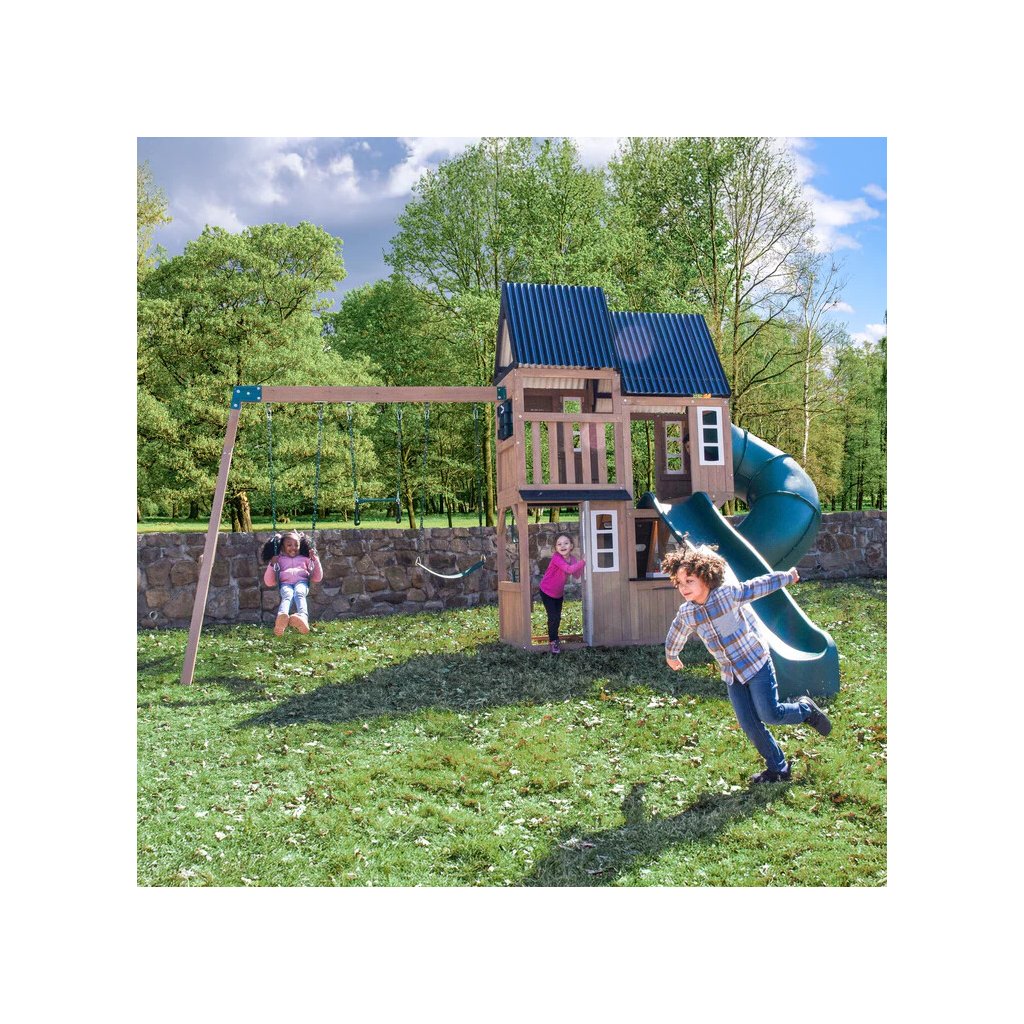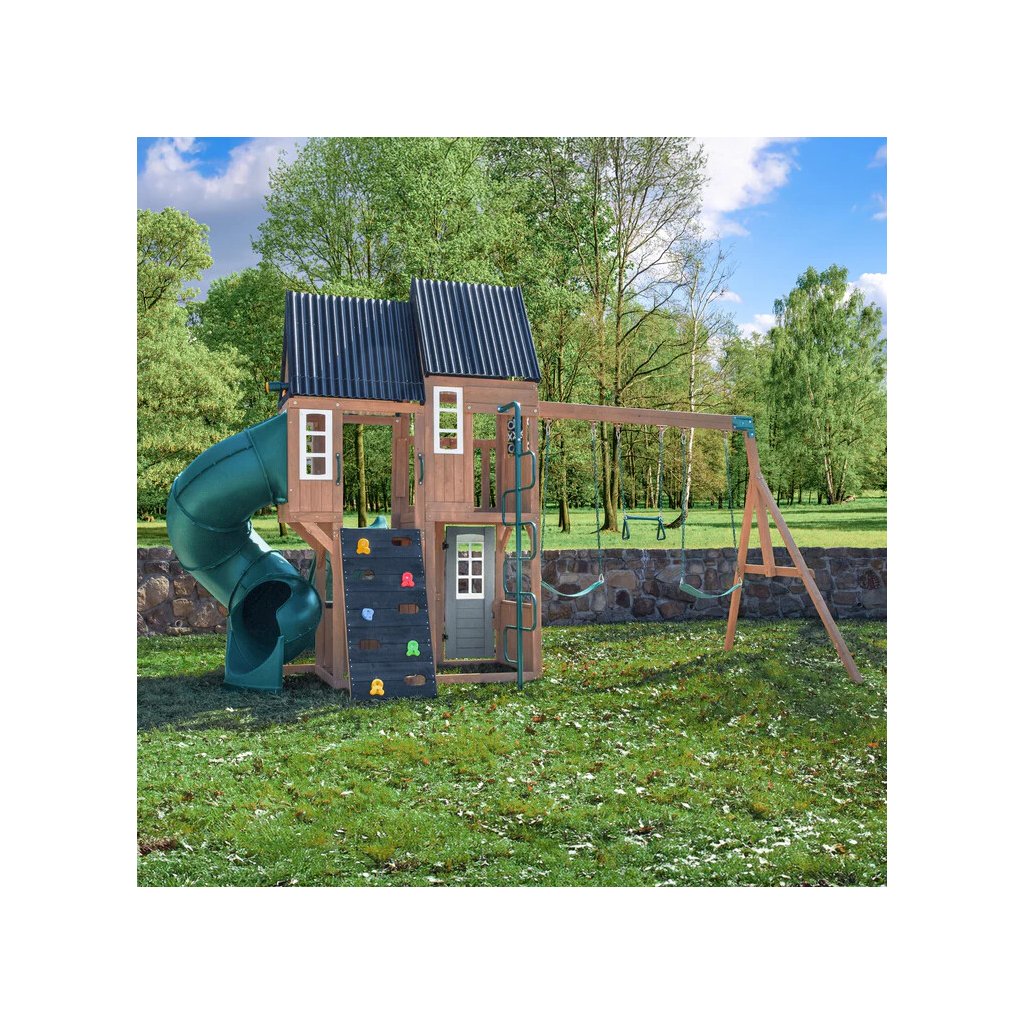 Dětské hřiště Acadia Manor s turbo tobogánem a skluzavkou je prémiová víceúrovňová herní sestava vyrobená z luxusního cedrového dřeva, která kombinuje aktivní pohyb s kreativní a tematickou hrou. Díky nadčasovému designu a kvalitnímu zpracování se stane přirozenou dominantou každé zahrady.