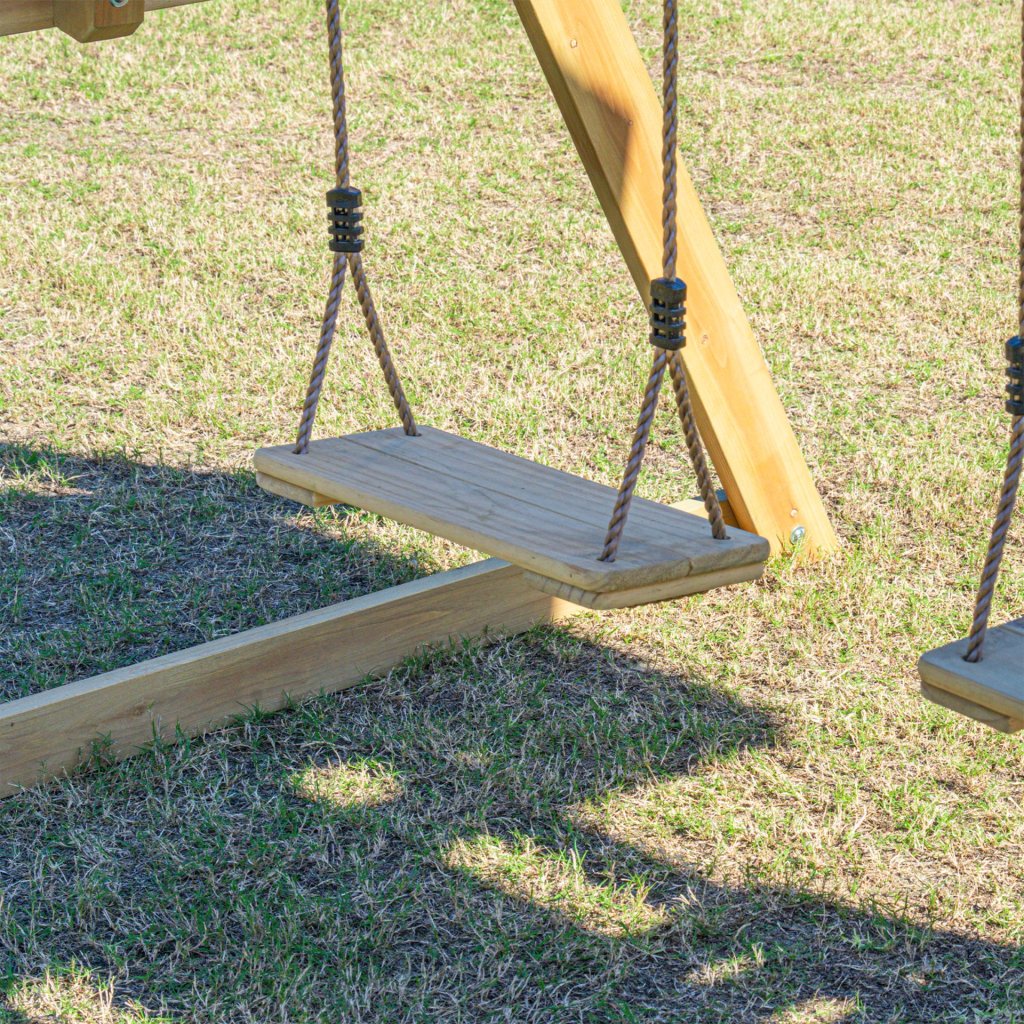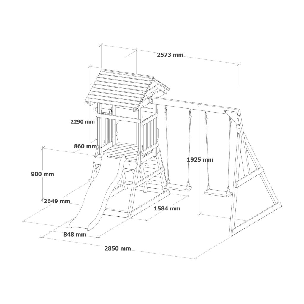 Součástí herní věže je rozšířující houpačkový modul, na kterém jsou umístěné dvě dřevěné houpačky. Všechny plastové části jsou z celoprobarveného, stálobarevného, UV odolného plastu pro celoroční užítí venku. Zemní kotvy jsou také součástí dodávky, aby sestava byla v terénu bezpečně uchycena.