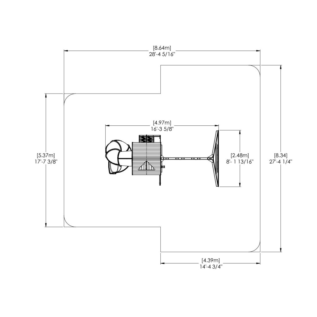 Luxusní věž je navržena jako domeček, z které mají děti báječný výhled do okolí. Horní podesta je přístupná kombinovanou lezecí stěnou s dřevěnými stupni a plastovými lezeckými kameny, doplněna o šplhací lano, které dětem usnadní výlez na podestu. Z horní podesty si děti užijí jízdu na turbo tobogánu v délce 365cm.