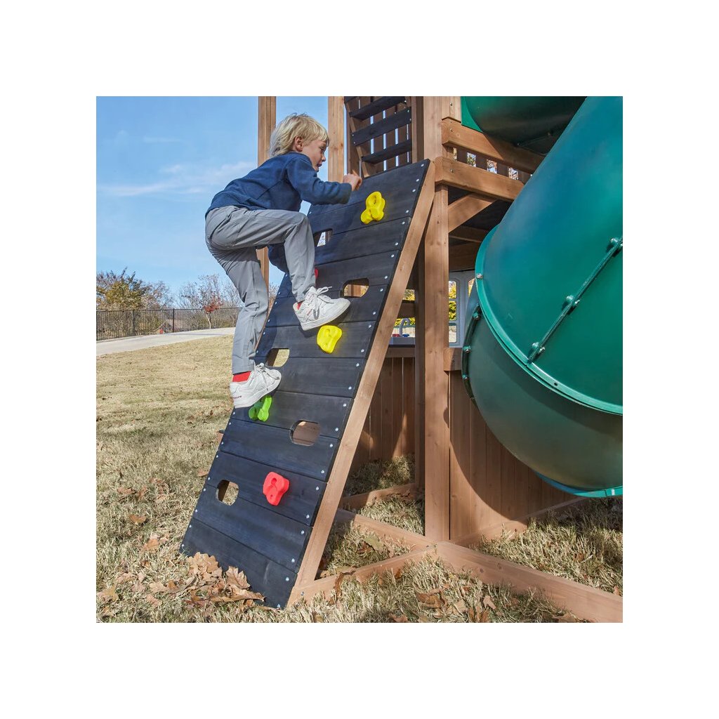 Hřiště je navrženo tak, aby podporovalo přirozený pohybový rozvoj dětí. Lezecká stěna s barevnými úchyty rozvíjí sílu, koordinaci i rovnováhu, zatímco jednotlivá patra a schody pomáhají budovat jistotu pohybu a orientaci v prostoru. Vyvýšená věž se střechou slouží jako ideální místo pro hru i odpočinek.