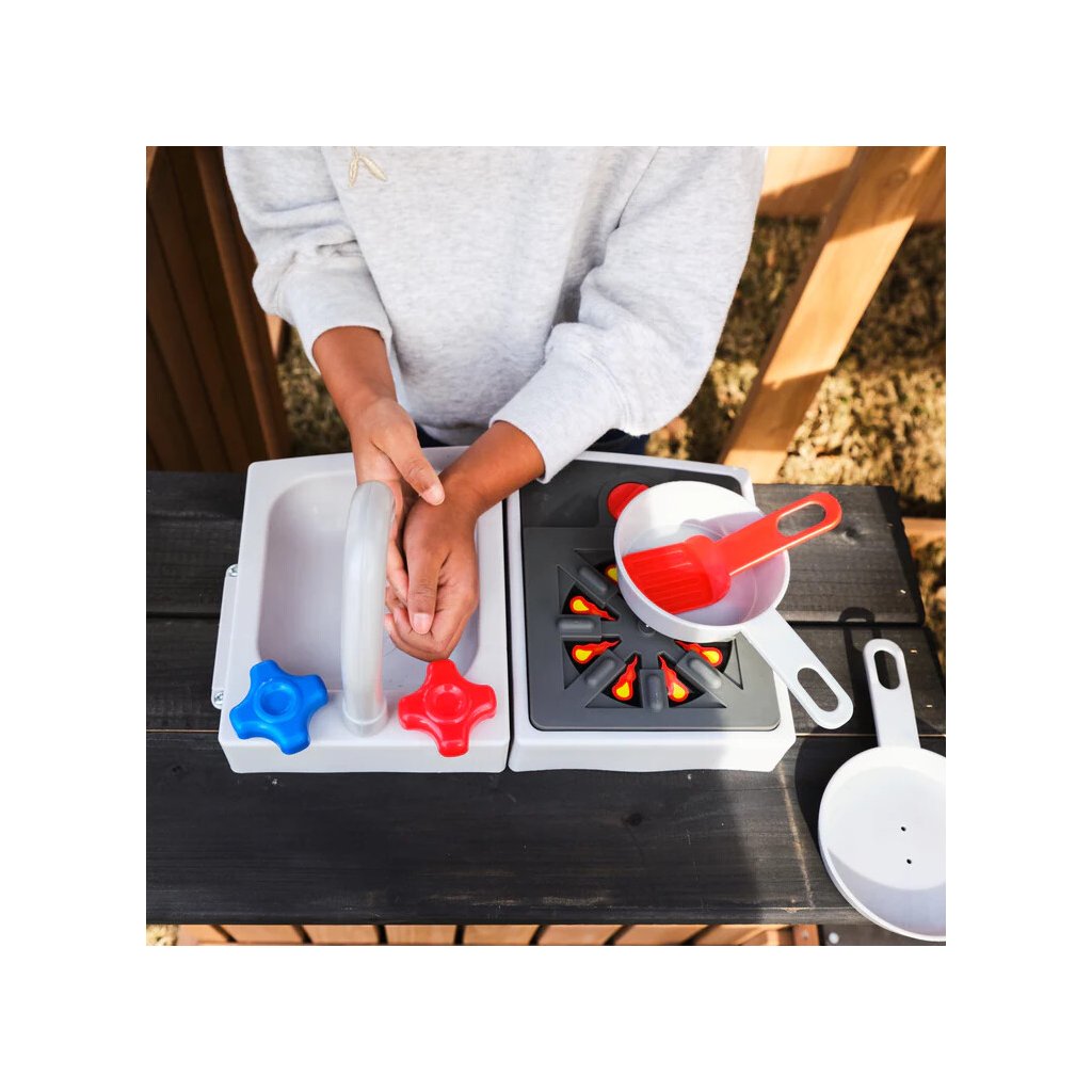 Ve spodní části se nachází domeček s okénky, ideální pro menší děti, a praktický piknikový modul se stolem a lavičkami, který vybízí ke klidnějším hrám, svačinám i společným chvílím s kamarády.