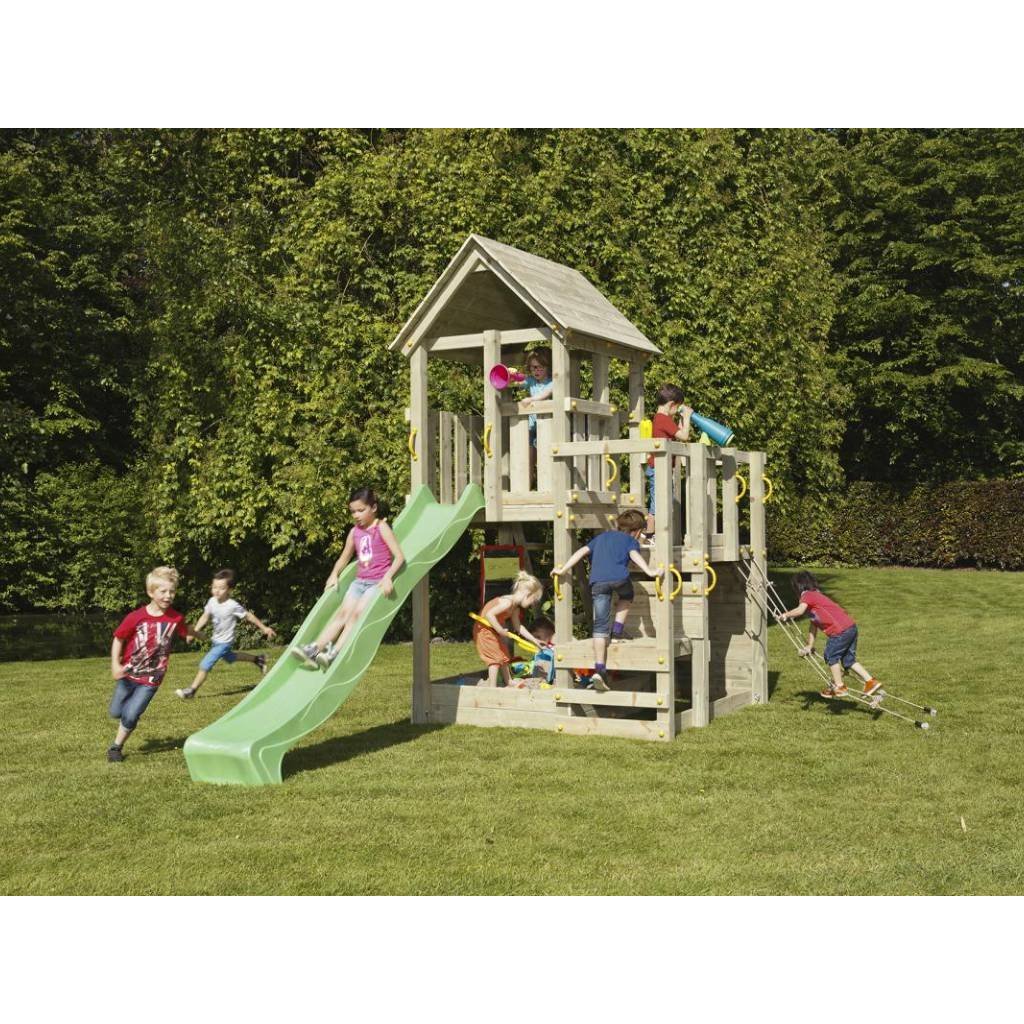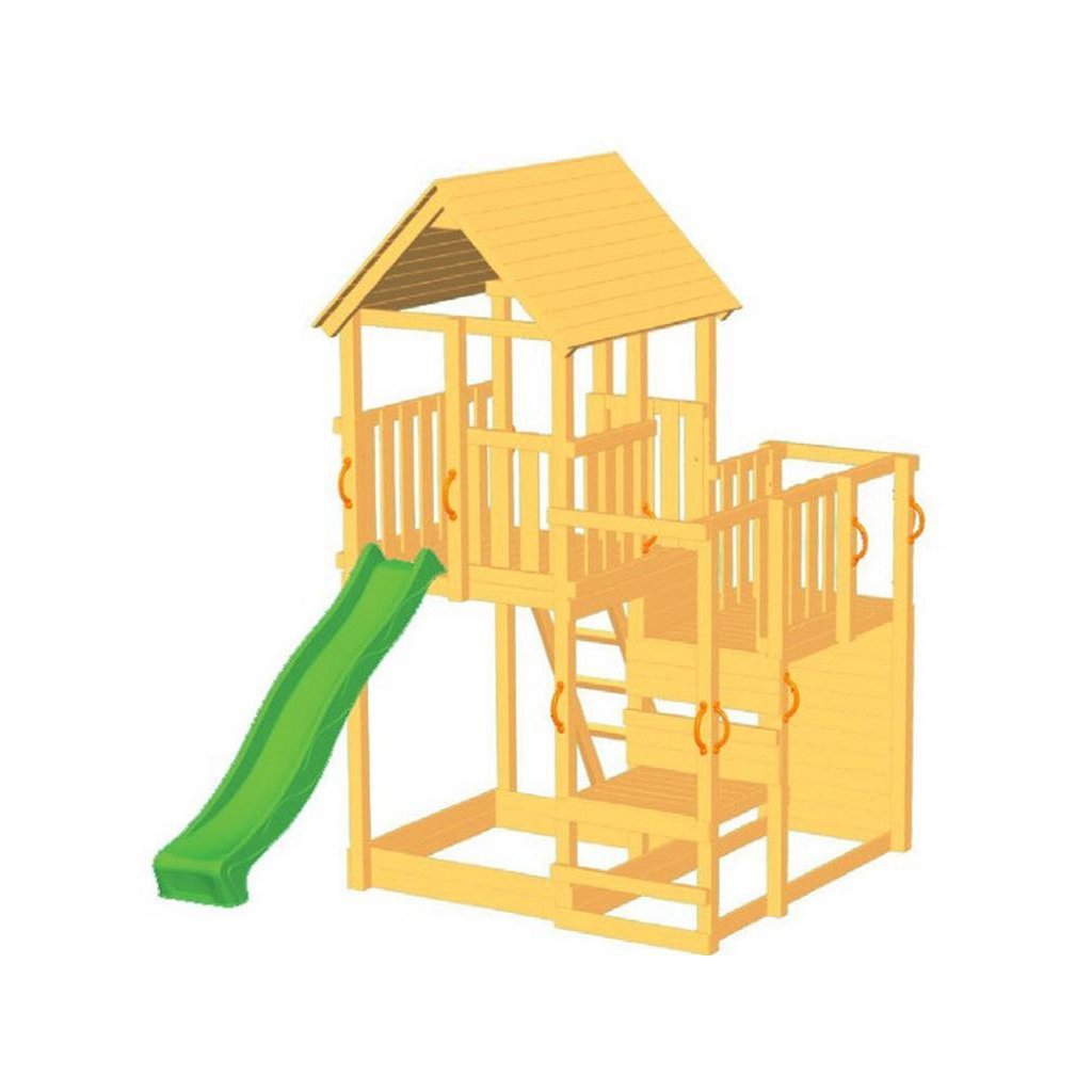 Vícepodlažní věž s dřevěnou střechou a skluzavkou v délce 295 cm.