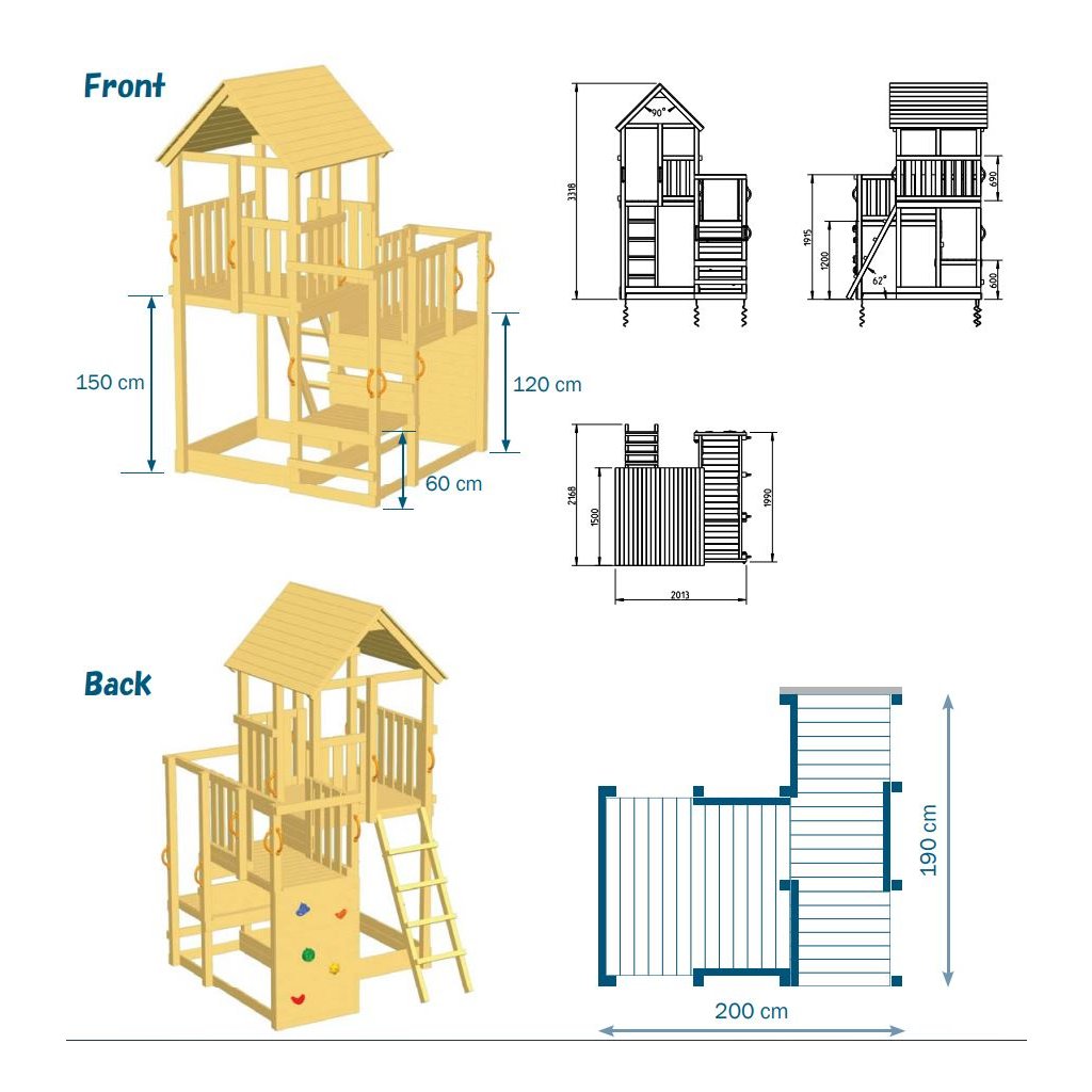 Věž je přístupná z podesty ve výšce 60 cm, z druhé strany lezecí stěnou do výšky 120 cm nebo dřevěnými schůdky do výšky 150 cm. Je tak přístupná dětem všech věkových kategorií. Ve spodní části hřiště je prostor, který lze využít jako pískoviště