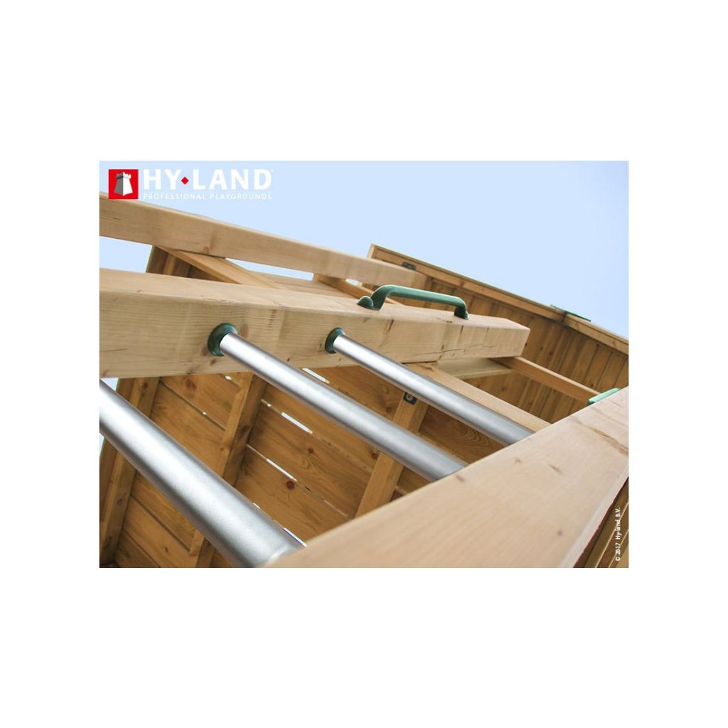 Větší herní sestava s plastovou skluzavkou a pískovištěm Hy-land P4 je vhodná pro mateřské školy, restaurace, obce a městské parky, kempy a hotely. Tuto sestavu je vhodné umístit i k základním školám, školním družinám. Dětské hřiště Hy-land P4 je vyrobené z kvalitního smrkového (borovicového) dřeva, které je impregnované. Impregnace zaručuje dlouhou životnost tohoto dětského hřiště. Pro další prodloužení životnosti doporučujeme natírat zdravotně nezávadnými lazurami z naší nabídky. Betonovací kotvení nejen zajistí výbornou stabilitu, ale také oddělí nosnou konstrukci od zeminy a tím zabrání pronikání vlhkosti do dřeva. Skluzavka je u dojezdu také kotvena masivní betonovací kotvou.