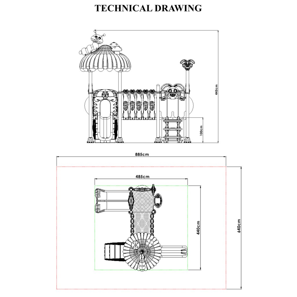 Sestava se skládá z: 1x věže se střechou ve tvaru houby a skluzavky dlouhé 2,1 m ve veselém designu, dále má sestava úžasnou dvojitou skluzavku o délce 2,2 m. Na sestavu mohou děti nastupovat po širokých a bezpečných schůdcích nebo pomocí nášlapného žebříku.