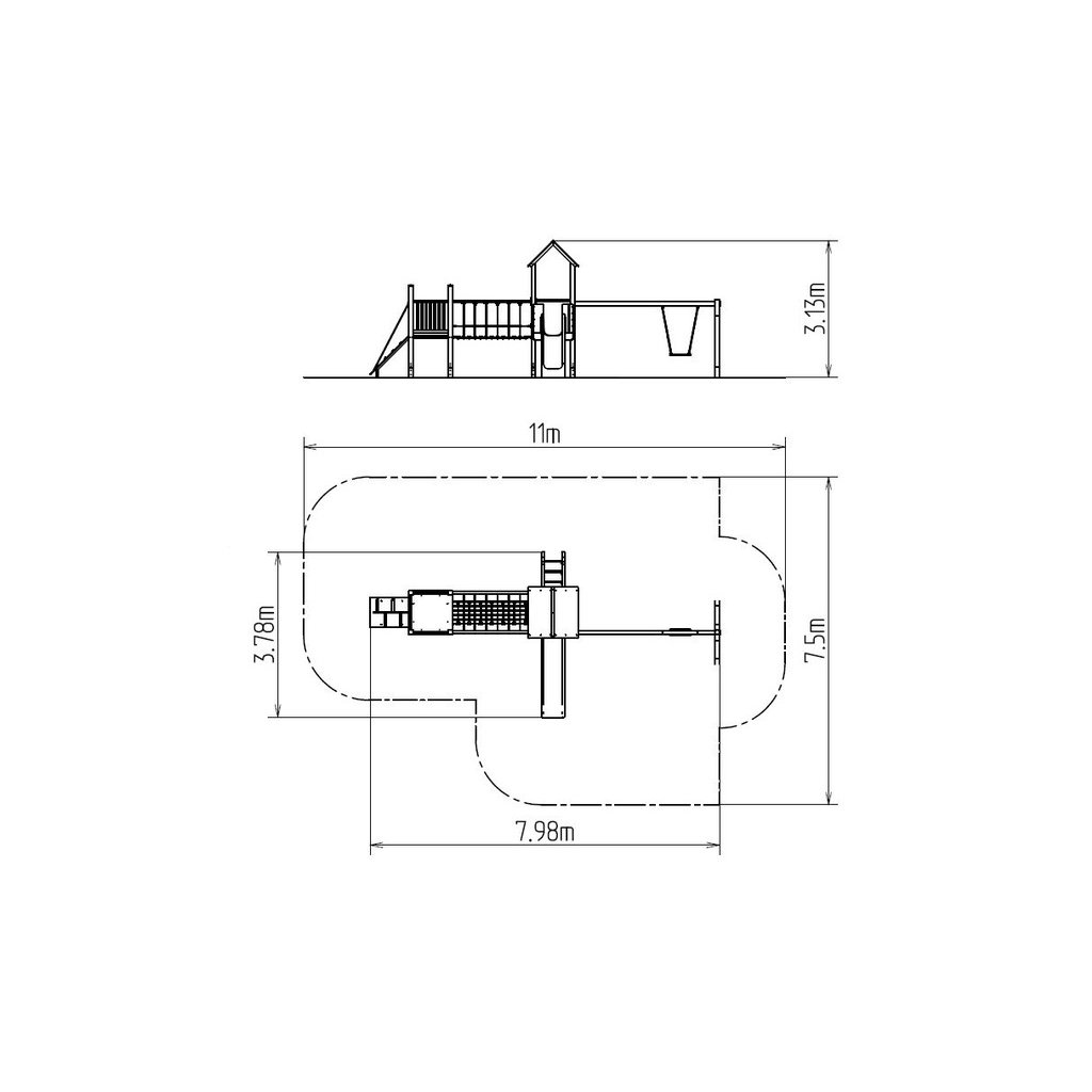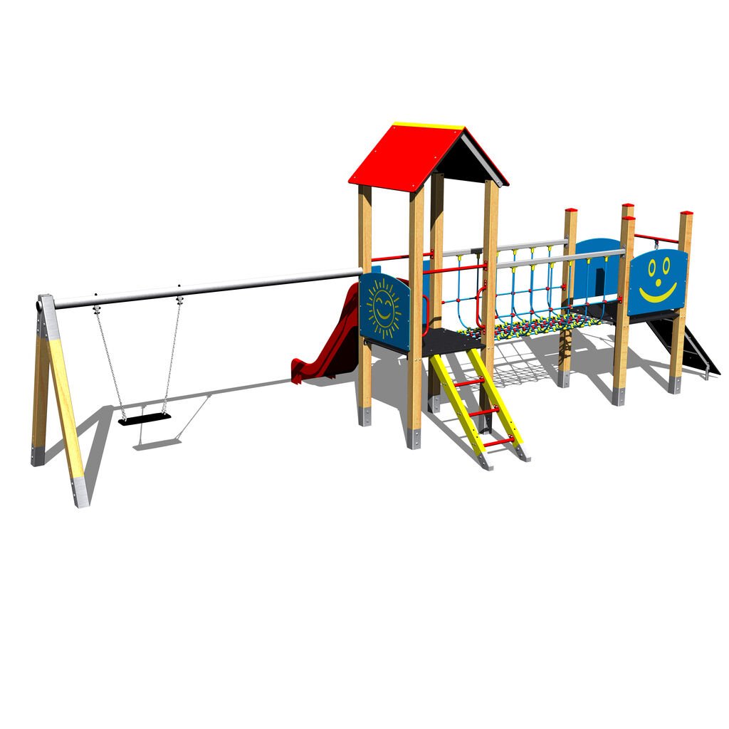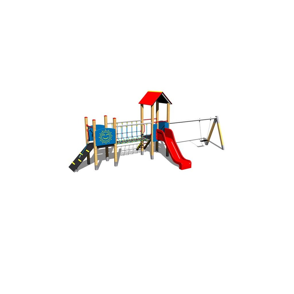 Sestava se skládá z: 1 x věže bez střechy, 1 x věže se střechou ve tvaru "A" a kovovým zábradlím, laminátové skluzavky, šikmé plošiny s s lanem a nášlapy z HDPE, 1 x šikmého žebříkového nástupu s kovovými nášlapy a řetězové houpačky s kovovým ráhnem.