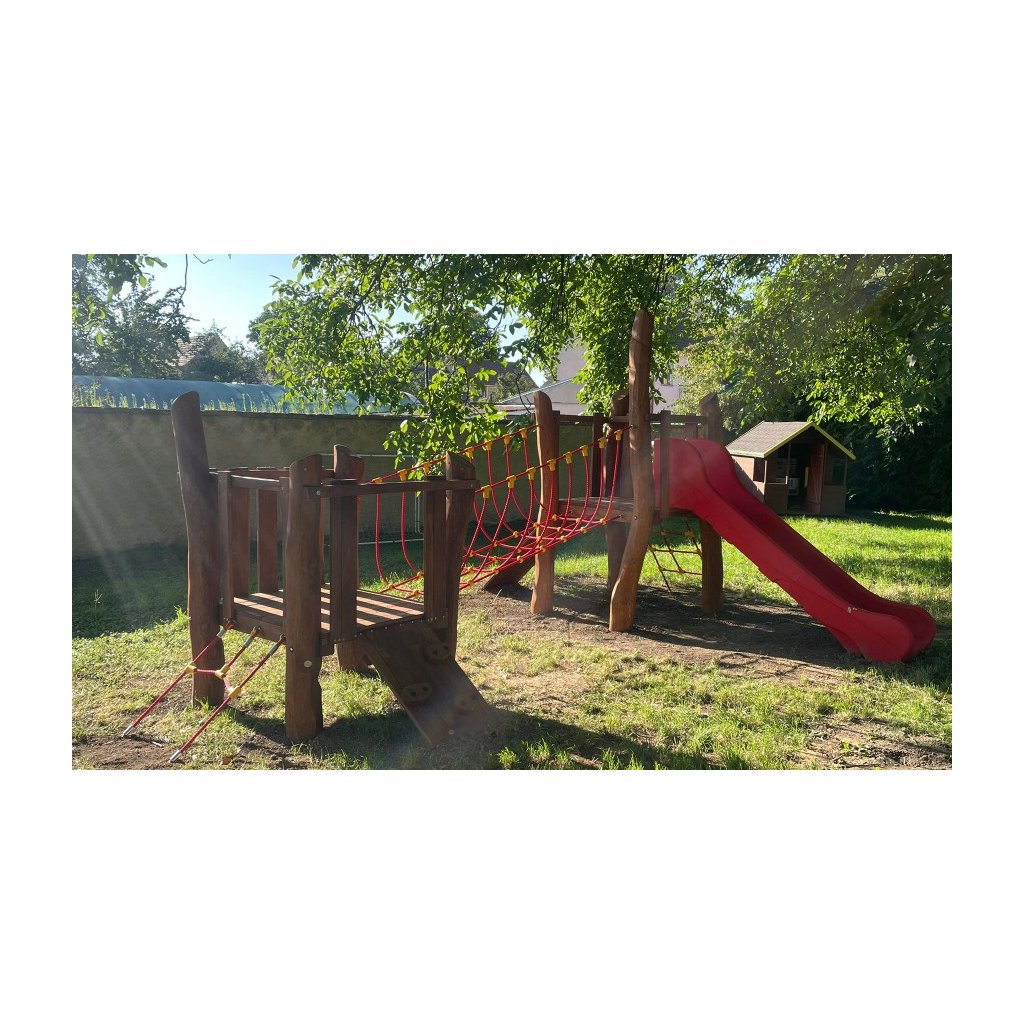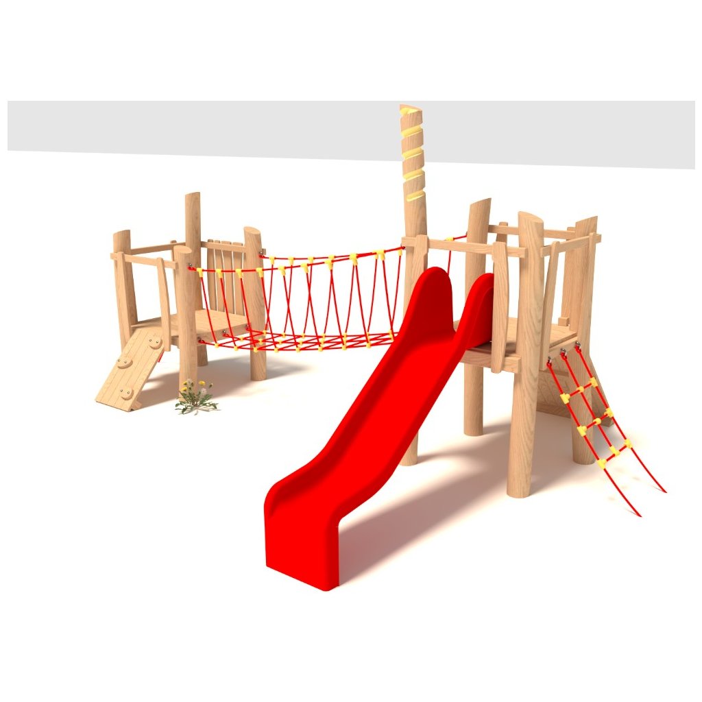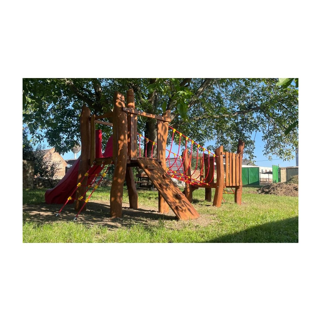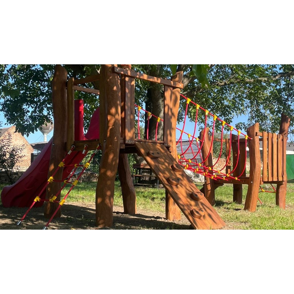 Krásná masivní herní sestava se skluzavkou z akátu - Laco je vyrobená z kvalitního a odolného akátového (dubového) dřeva, které je natřené lazurou (odstín dle přání zákazníka, případně může dřevo zůstat bez ošetření). Sestava je z tvrdého dřeva má dlouhou životnost bez větších nároků na údržbu.. Herní sestava je složena z těchto částí - dvou věží bez střechy (ve dvou výškách - 0,6 a 1 m), jejich stojky jsou zabetonovány pevně do terénu. Obě věže jsou spojeny adrenalinovou šikmou sítí s lanovým zábradlím na jedné straně. Vstup na sestavu je možný více způsoby -1 x šikmá plošina s výstupky pro snadné lezení i pro menší děti a dále po šikmé lezecí síti z odolných lan Herkules. Děti si mohou vybrat vstup dle svého věku a schopností. K sestavě je připojena laminátová skluzavka.