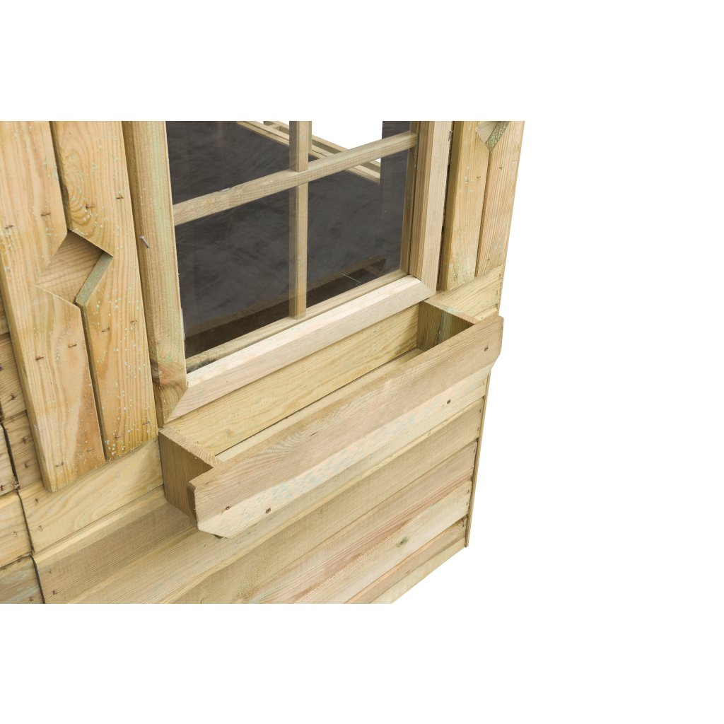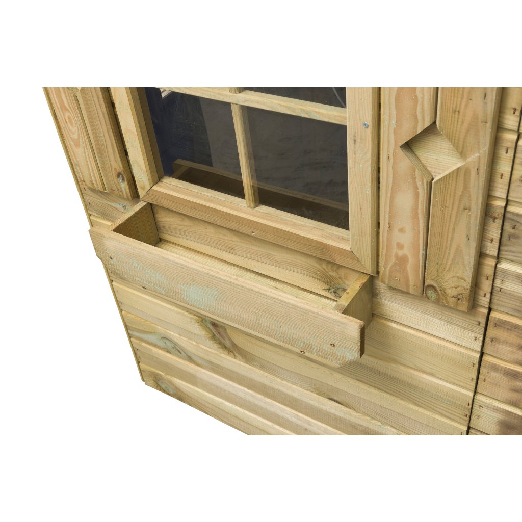Domeček má velké okna vyplněné plexisklem. Vstup do domku zajišťují dvoudílné dveře. Pod okny naleznete truhlíky na květiny.