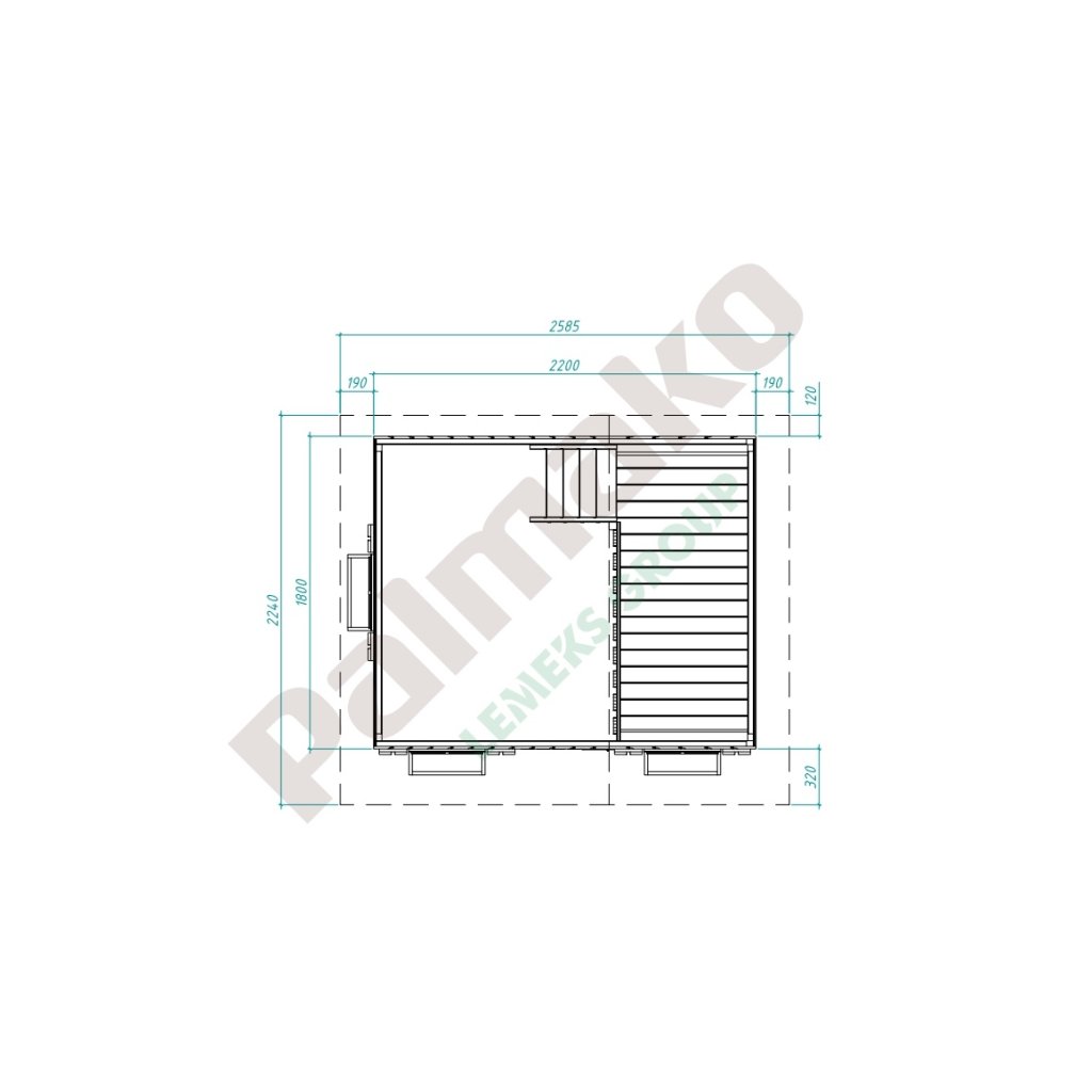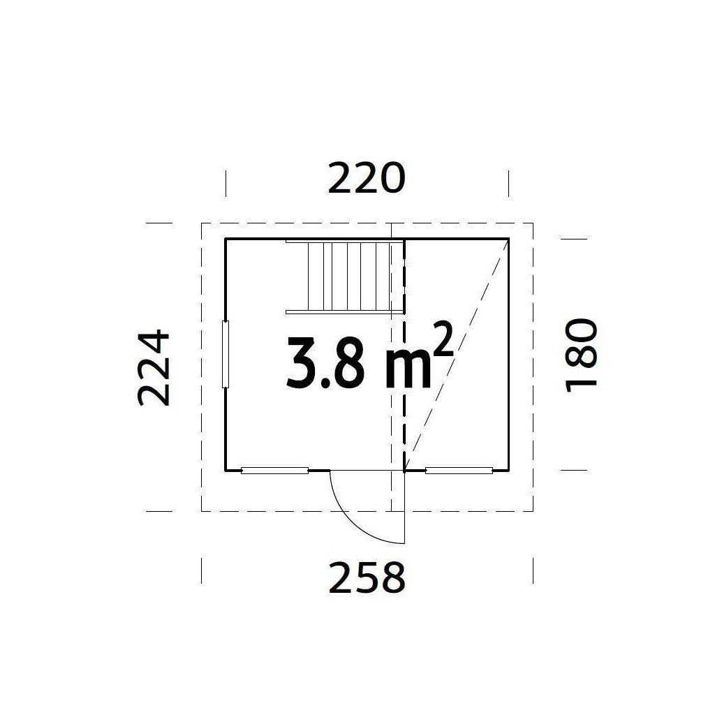 Domeček má okno o rozměru 35 x 35 cm , vyplněné plexisklem. Vstup do domku je zajištěn dveřmi o rozměru 48 x 115 cm, které se otevírají směrem ven. Přesah přední stěny je 32cm, výška stěny 125/177 cm, výška hřebene 228 cm.