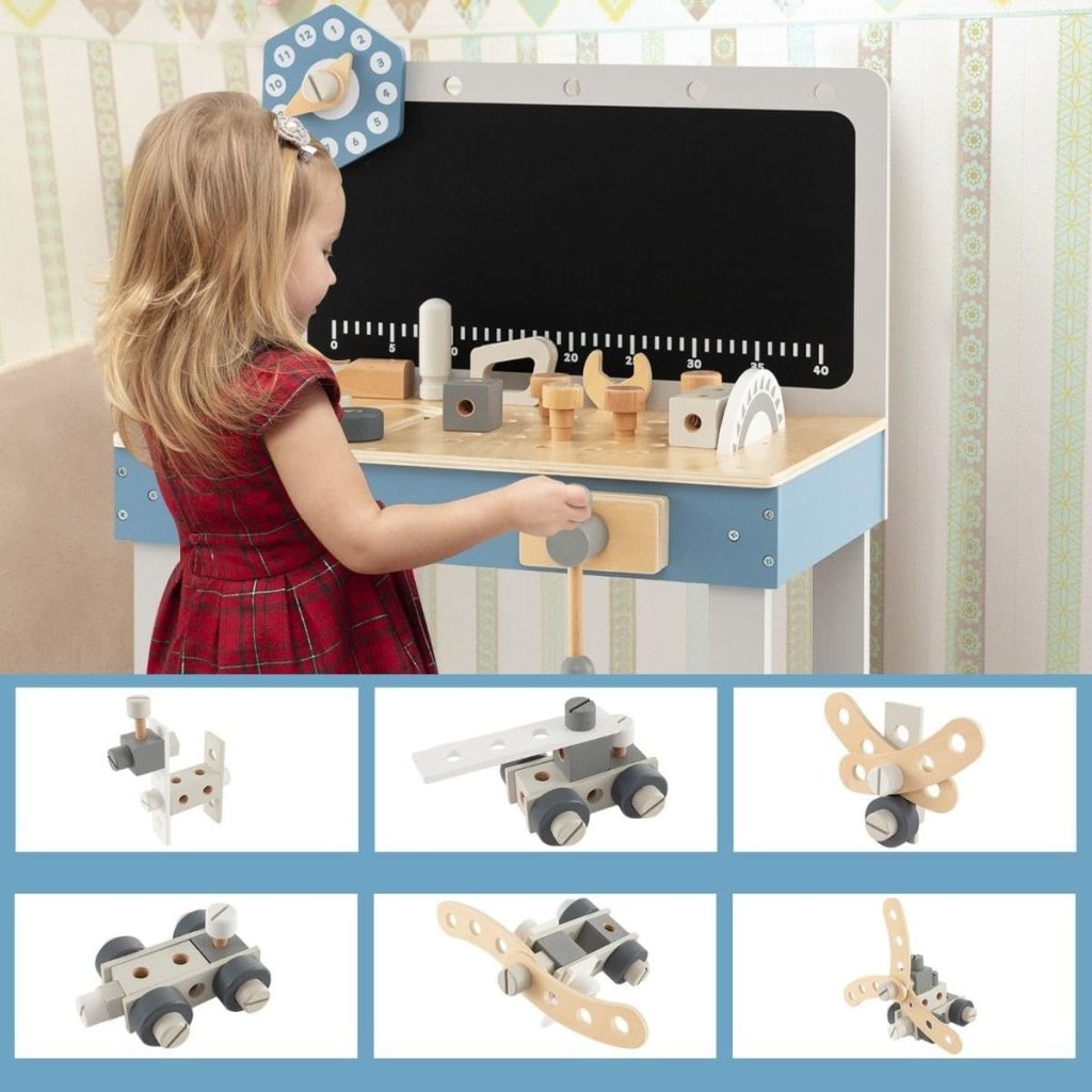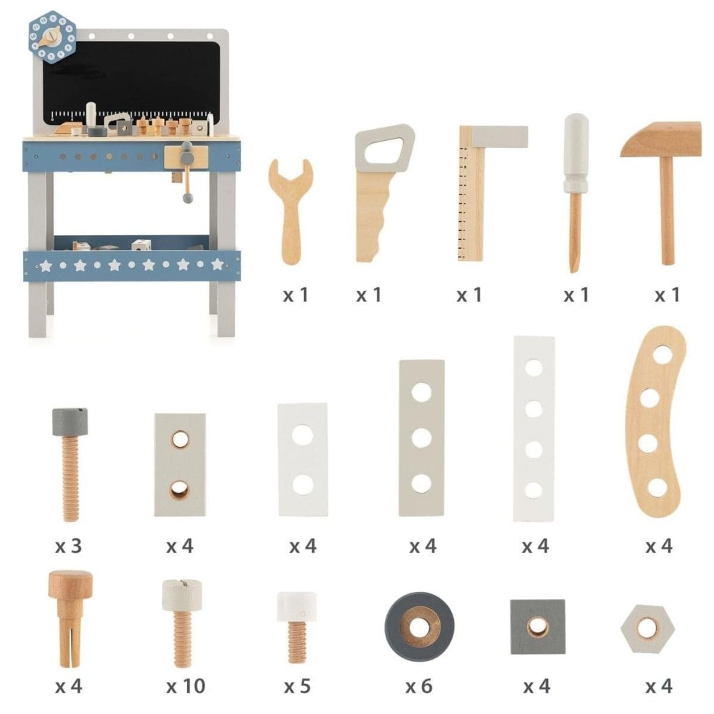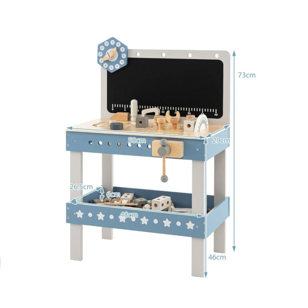 Robustní konstrukce kombinuje přírodní dřevo s jemnými modrými a bílými prvky, což z něj činí nejen praktickou, ale i stylovou součást dětského pokoje. Součástí stolu je řada dřevěného nářadí a dílků, které podporují kreativitu, jemnou motoriku a technické myšlení.