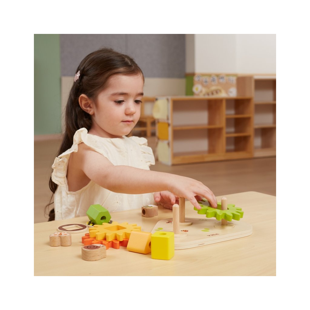 Děti vkládají barevné geometrické dílky do správných otvorů (trojúhelník, čtverec, kruh apod.), čímž procvičují rozpoznávání tvarů a barev, logické myšlení a přesnou koordinaci ruka–oko. Součástí jsou také ozubená kola, která se po otočení jednoho dávají do pohybu všech — dítě tak „na vlastní kůži“ pozná, jak funguje převod a vzájemné propojení mechanismu.
