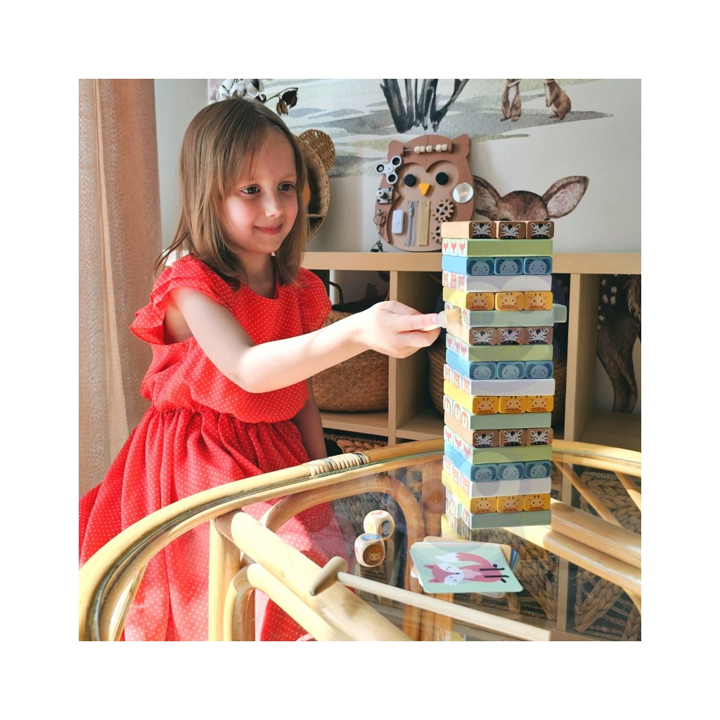 Děti mohou hrát klasické skládání věže, variantu s kostkou se zvířátky nebo paměťovou hru s kartami, díky čemuž je hra velmi variabilní.