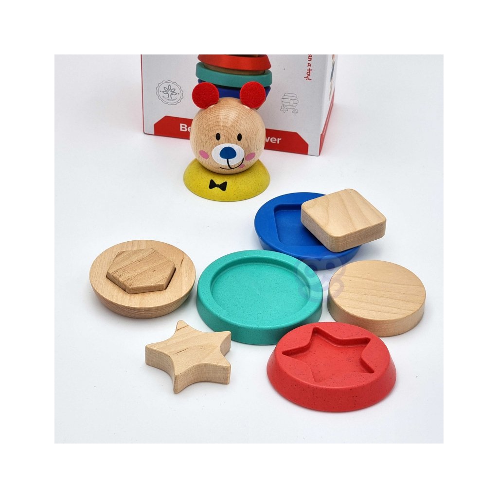 Ponořte se do světa barev, tvarů a dovedností s roztomilým dřevěným medvídkem, který skrývá překvapení uvnitř.