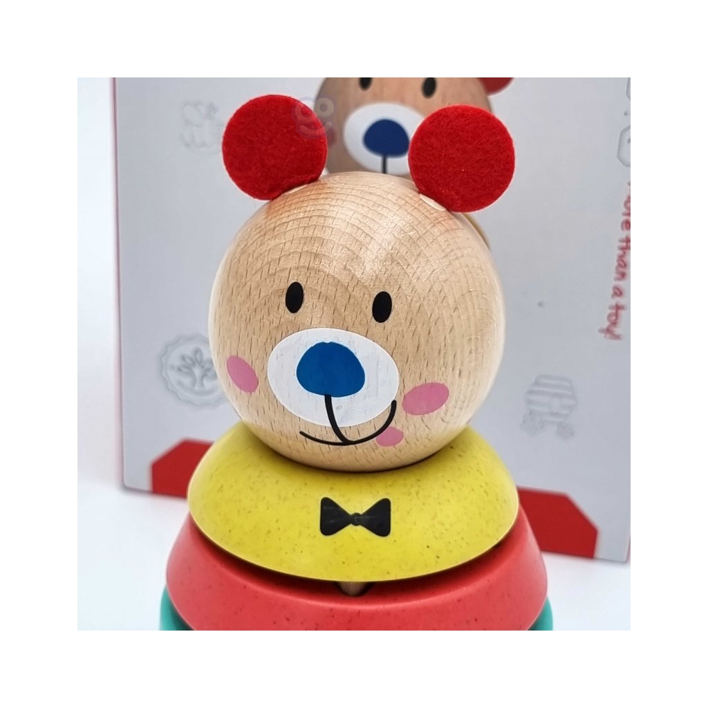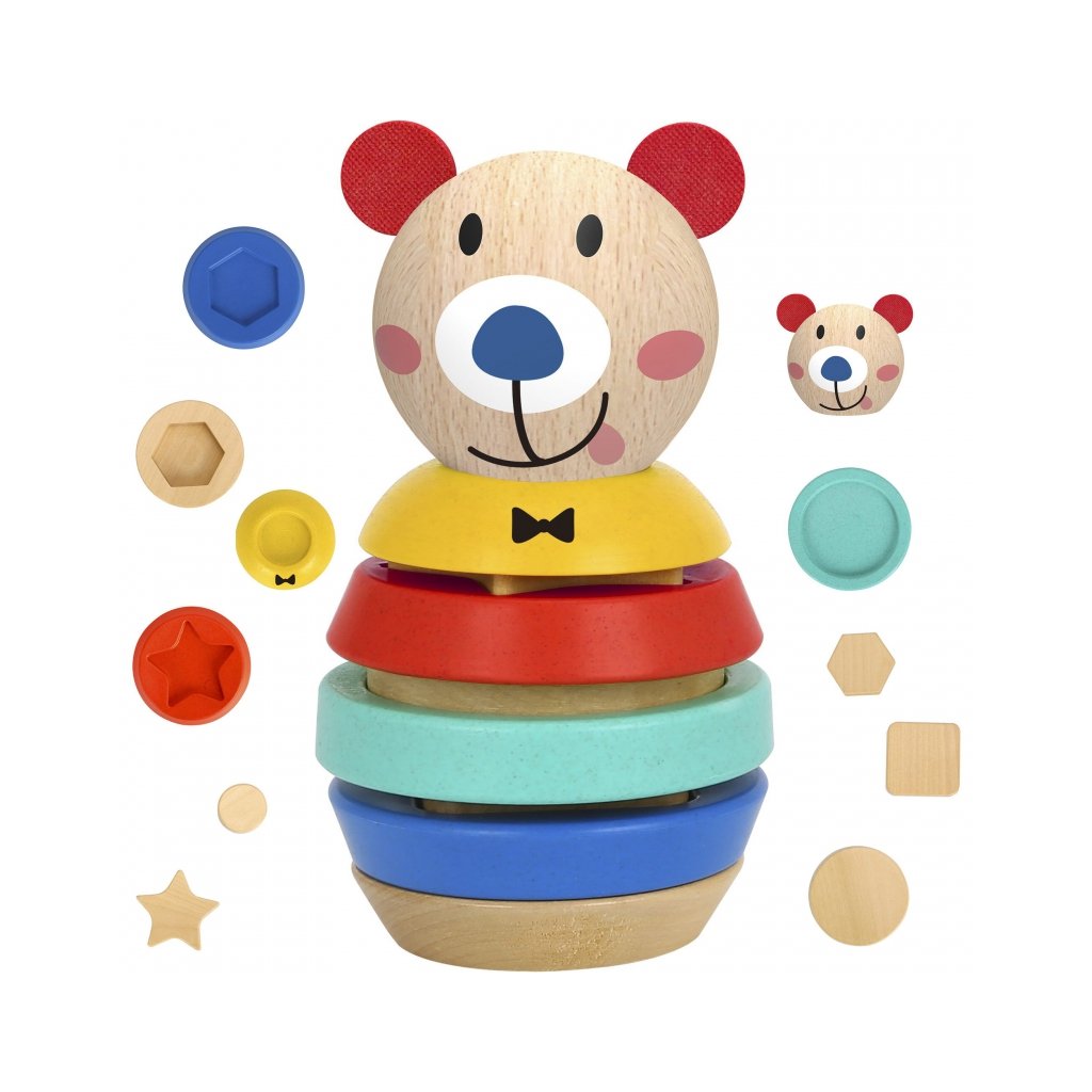 Tato pyramida-ukládanka je určená pro děti od 12 měsíců a sestává z 11 pečlivě zpracovaných dílů – prstenců a tvarových kousků v různých barvách a velikostech, které společně tvoří postavu medvídka.