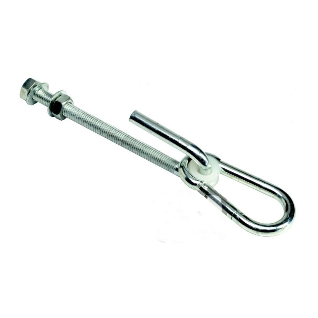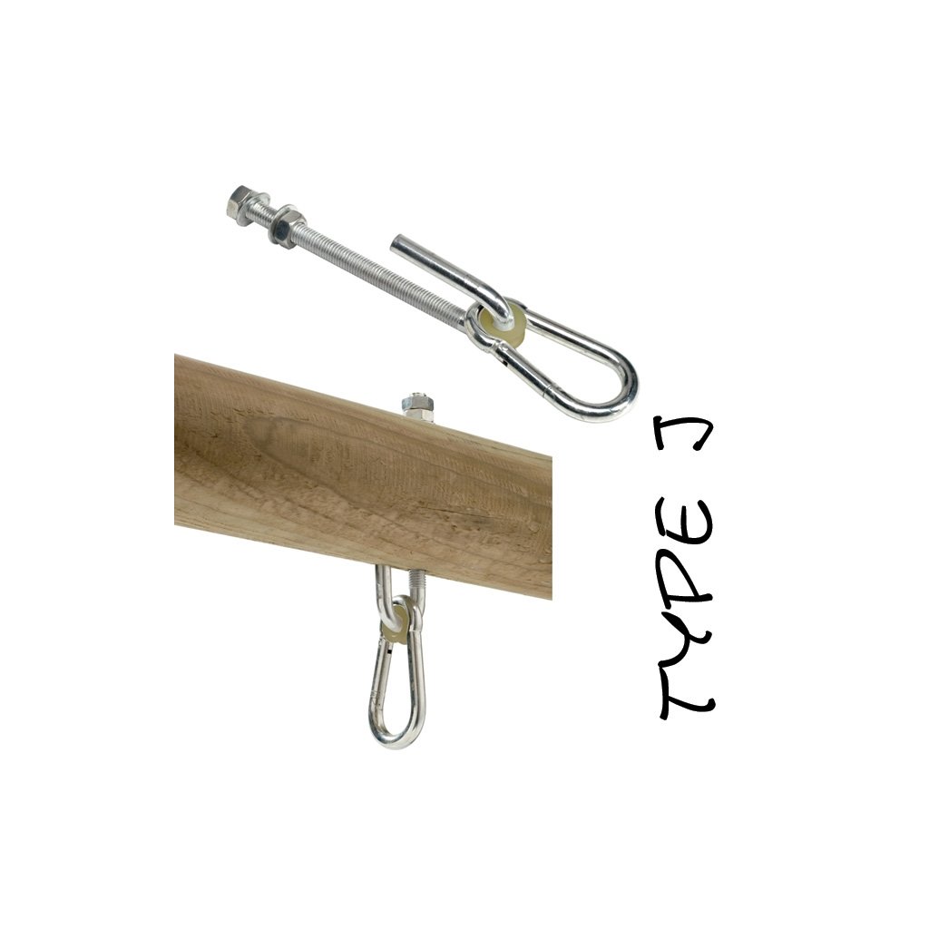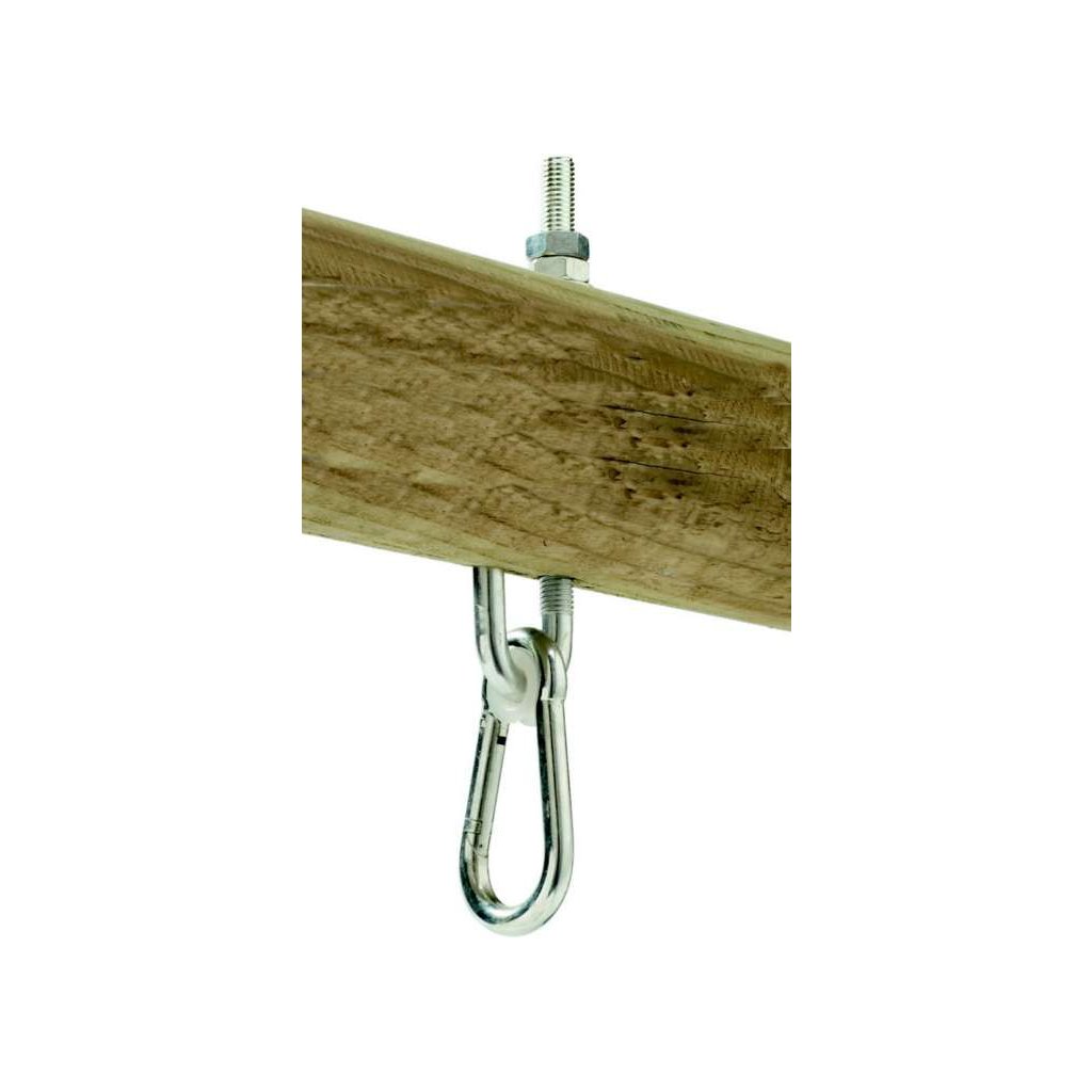 Houpačkové háky k zavěšení houpaček do dřevěné konstrukce. Systém šroubu a matky . Metrický závit je prostčen skrz otvor břevna a upevněn matkou. Dodávka obsahuje: 1ks