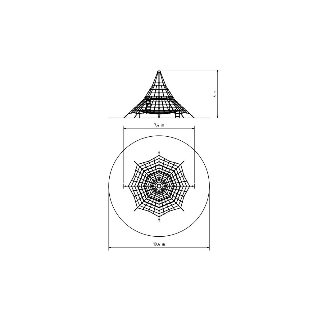 Lanová šplhací věž 5 m má ocelový sloup o průměru 159 mm, šplhací síť je vyrobena z lan Herkules (16 mm lana z polypropylenu s vnitřním ocelovým jádrem), k síti je připevněno ve výšce cca. 1 m také vnitřní lanové patro se šplhacím žebříkem a lanem s plastovými úchyty, nad ním je ještě jedno vodorovné síťové patro, kde mohou děti také odpočívat a hrát si. Napínací zámky (pomocí kterých se síť na pyramidě vypíná) jsou nerezové.