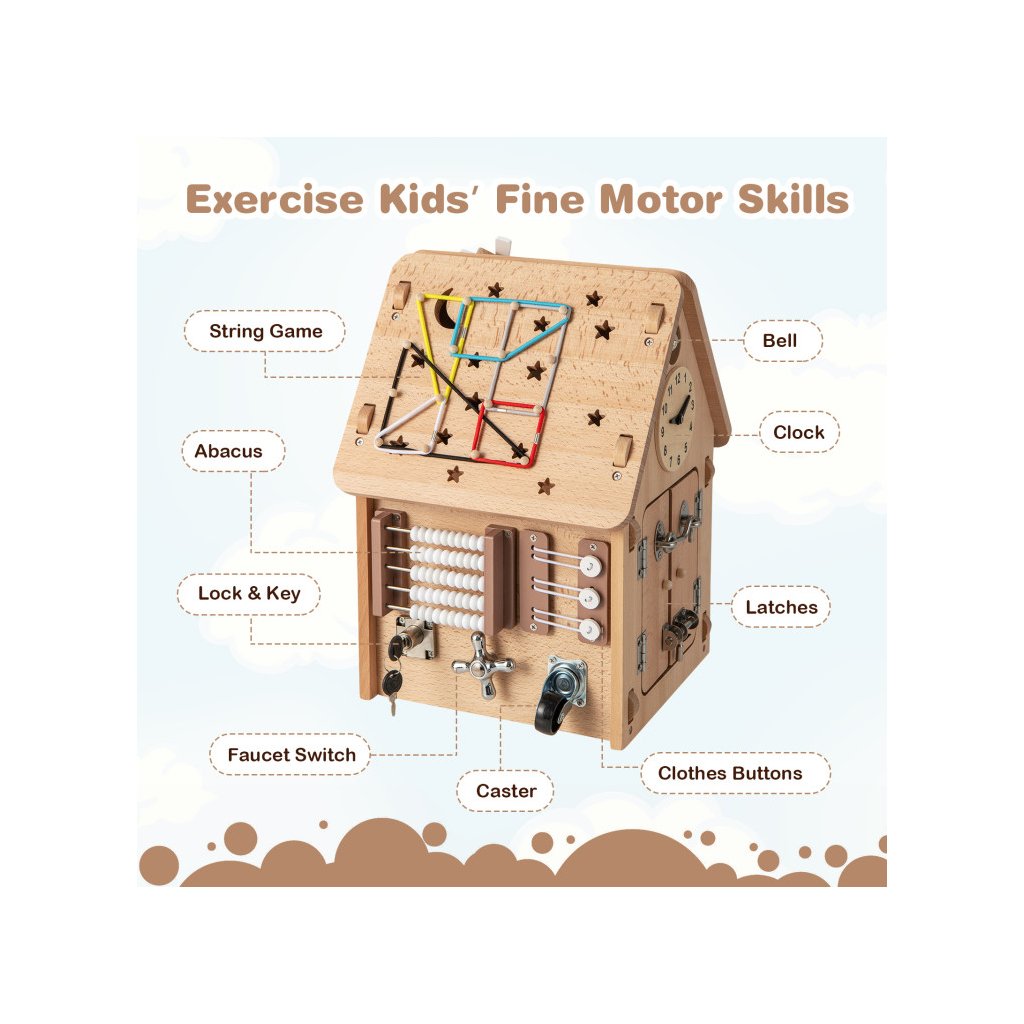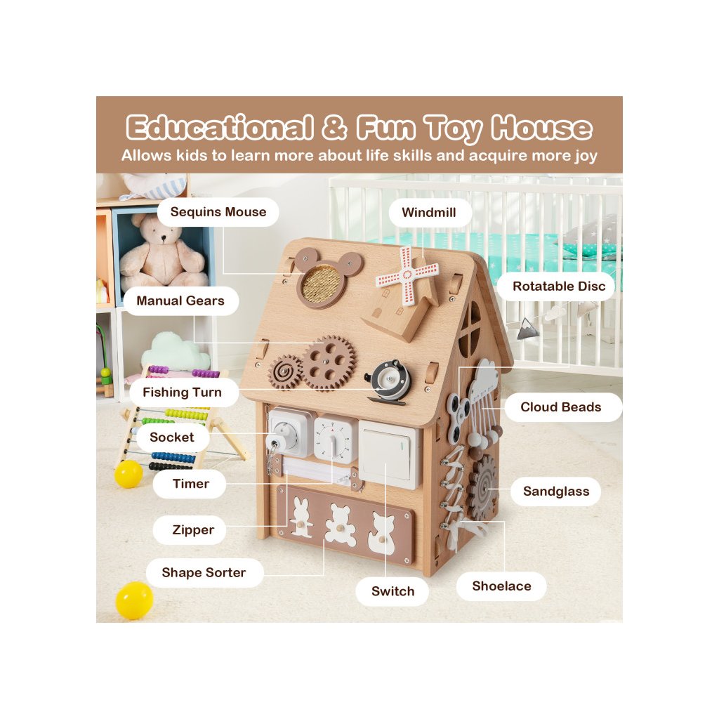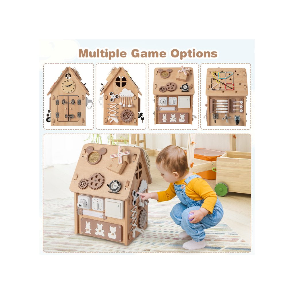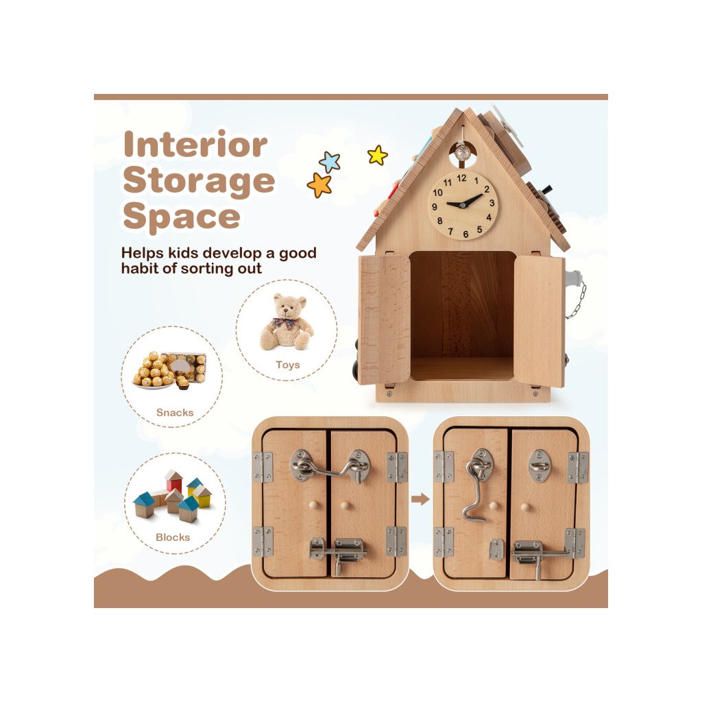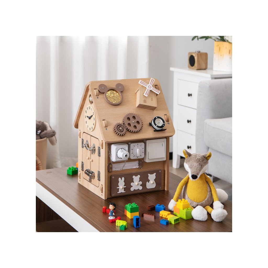 Tato vzdělávací hračka je vybavena mnoha hracími plochami, jako je Velcro, spínač, zásuvka, hodiny a západka, kde se děti mohou naučit více dovedností.