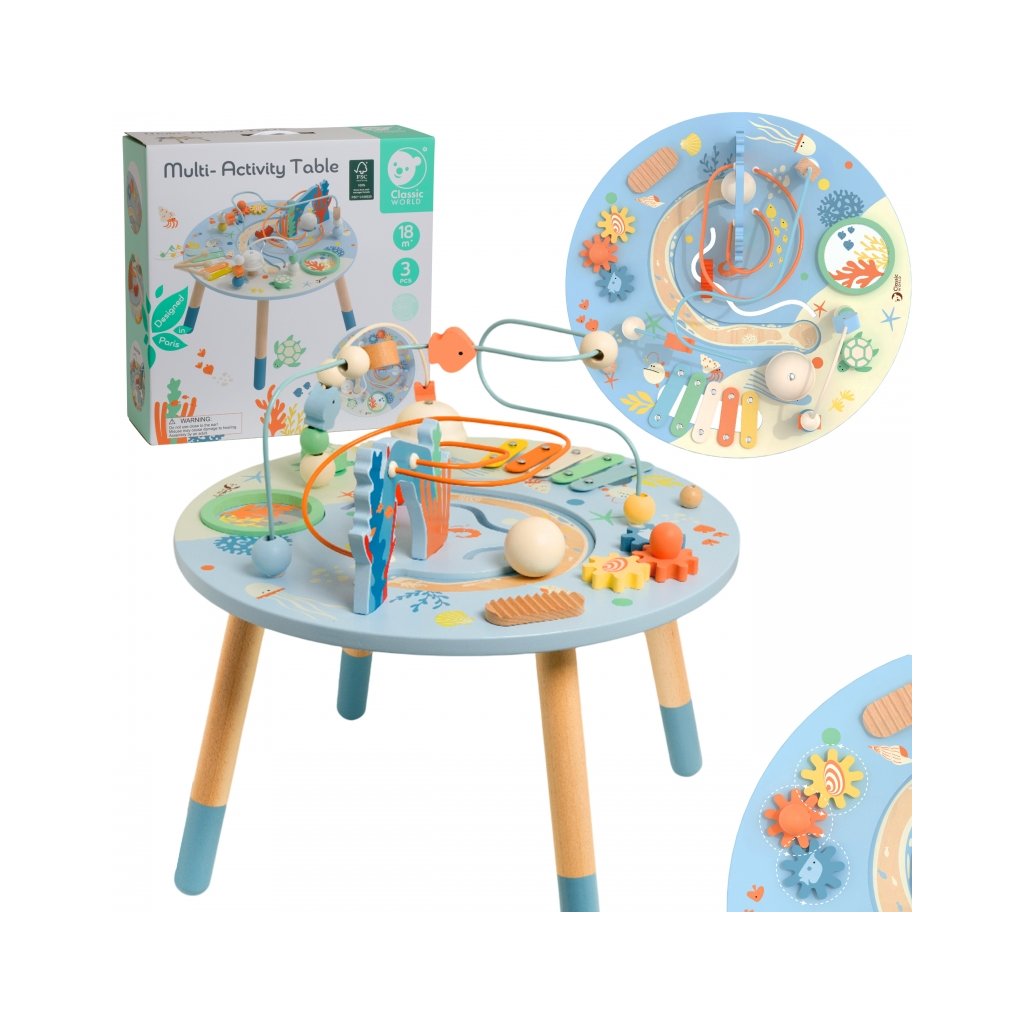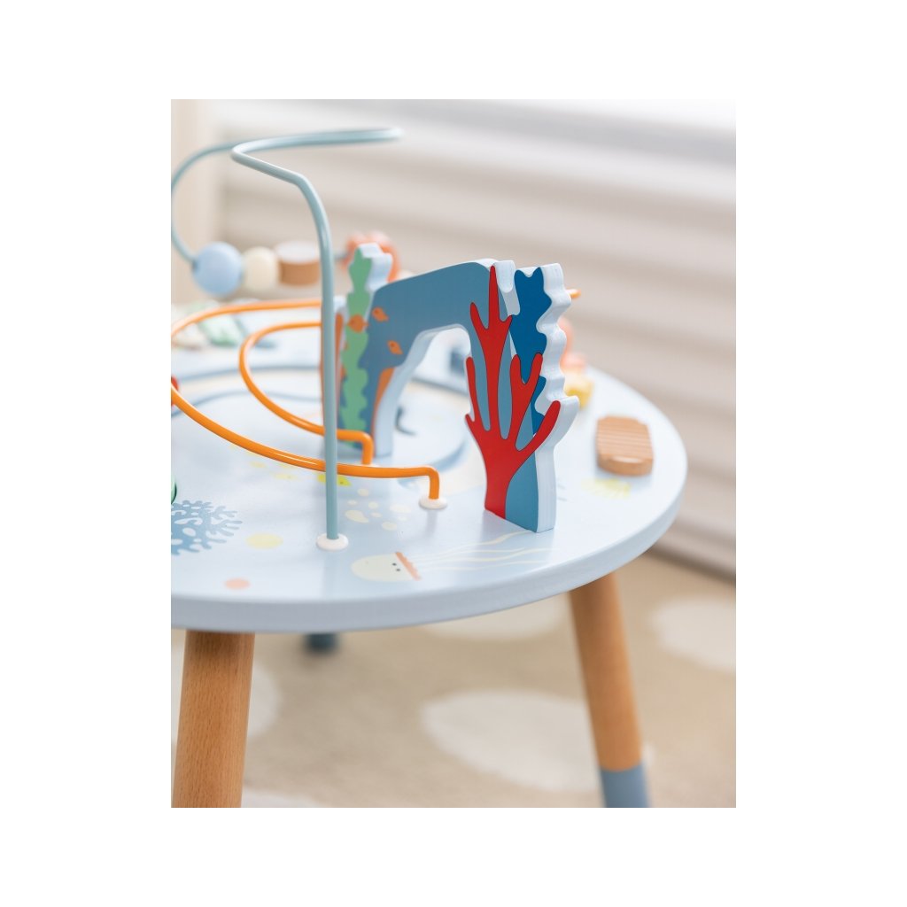 Montessori "Activity Board" - Mořský svět přináší dětem zábavu a učení v jednom. Montessori stolek nabízí množství interaktivních prvků – motoričky labyrinty, kolečka, kuličkové dráhy i hudební nástroje jako činely, bubínek nebo rolničku. Stolík rozvíjí jemnou motoriku, koordinaci ruka–oko, logické myšlení a smysl pro rytmus.