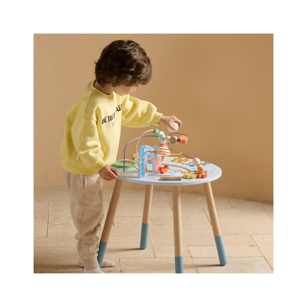 Hračka děti láká k hraní ve stoje, podporuje jejich pohyb a přirozenou aktivitu. Kvalitní dřevo, bezpečné barvy a precizní zpracování zajišťují bezpečnou a příjemnou hru. Tento stolík je ideální jako první „velký“ herní stůl, který roste s dítětem a nabízí nekonečné možnosti objevování a tvořivé hry.