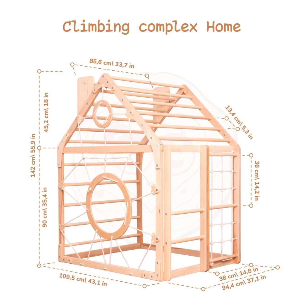 Montessori domeček Home si děti okamžitě zamilují, je to nekonečné šplhání, lezení, prolézání na celém domečku a navíc má domeček i oboustrannou lezecí stěnu s dřevěnými šplhacími body, kterou po otočení, můžete využít, i jako skluzavku, kterou bezpečně uchytíte k domečku. Oboustranou rampu mohou děti využít uvnitř domečku i jako stoleček, kde si mohou malovat a mohou kreativně tvořit svoje díla. Děti si mohou vylézt na domeček ze tří stran, jedna strana je z dřevěných příček, na kterých je v horní části střechy připrevněná pomocná příčka, jako komín domečku, která slouží pro jednodušší přelezení přes stříšku. Z druhé strany má domeček kombinaci lanové stěny s příčkami na lezení a prolézání a pokračují na vrchol stříšky přes dřevěné příčky a poslední strana domečku má dřevěné okénko, kterým mohou prolézat a okénko je upevněno pomocí přírodních lan, skrz které mohou také prolézat.