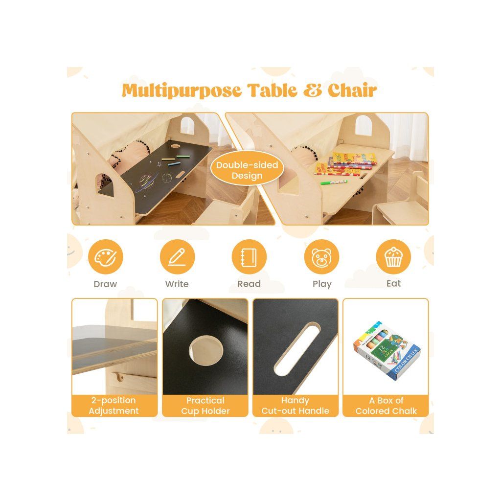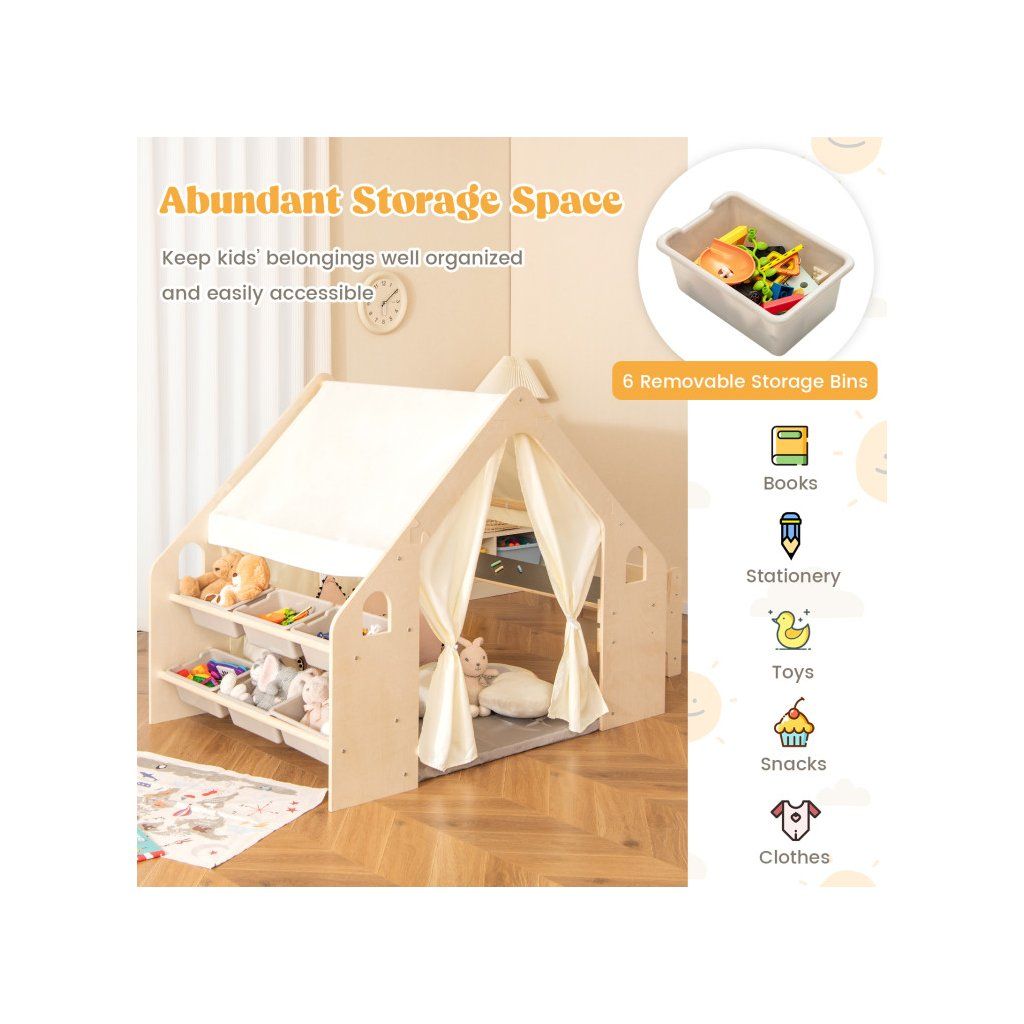 Tento domeček na hraní 6v1 je vybaven hracím stanem, podložkou, tabulí, stolem, úložným kontejnerem a židlí a nabízí dětem nepřeberné množství herních příležitostí.