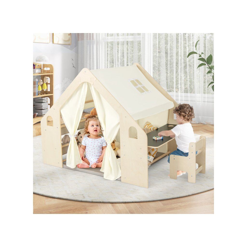 Kromě toho tento domeček na hraní v Montessori stylu slouží jako atraktivní prostor pro hraní, kreslení, čtení, psaní a dokonce i jídlo.