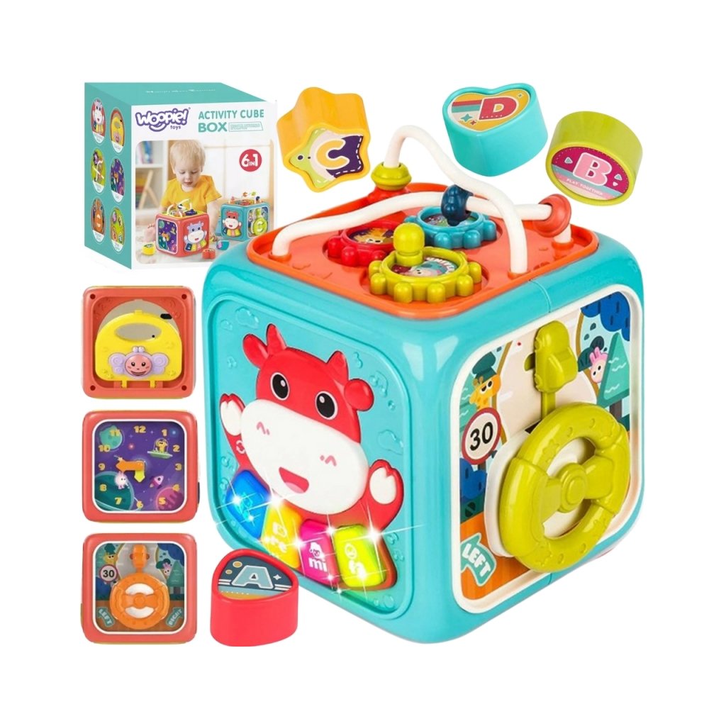 Tato barevná edukační kostka 6v1 je ideální hračkou pro zvídavé děti, které rády objevují svět kolem sebe. Každá strana kostky nabízí jinou aktivitu – otáčecí volant, vkládačku s tvary, bludiště, otočné kolečko, posuvné prvky nebo korálky na drátku. Díky tomu si dítě zábavnou formou rozvíjí jemnou motoriku, logické myšlení, koordinaci ruky a oka i rozpoznávání tvarů, barev a písmen.