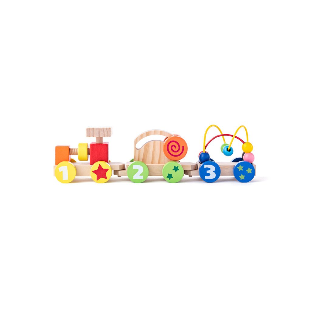 Montessori motorický vláček rozvíjí především jemnou motoriku a logiku. Děti mohou posouvat korálky na dřevěné konstrukci, otáčet šroubem, posouvat dřevěné kolečko.