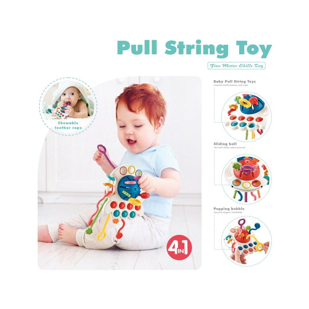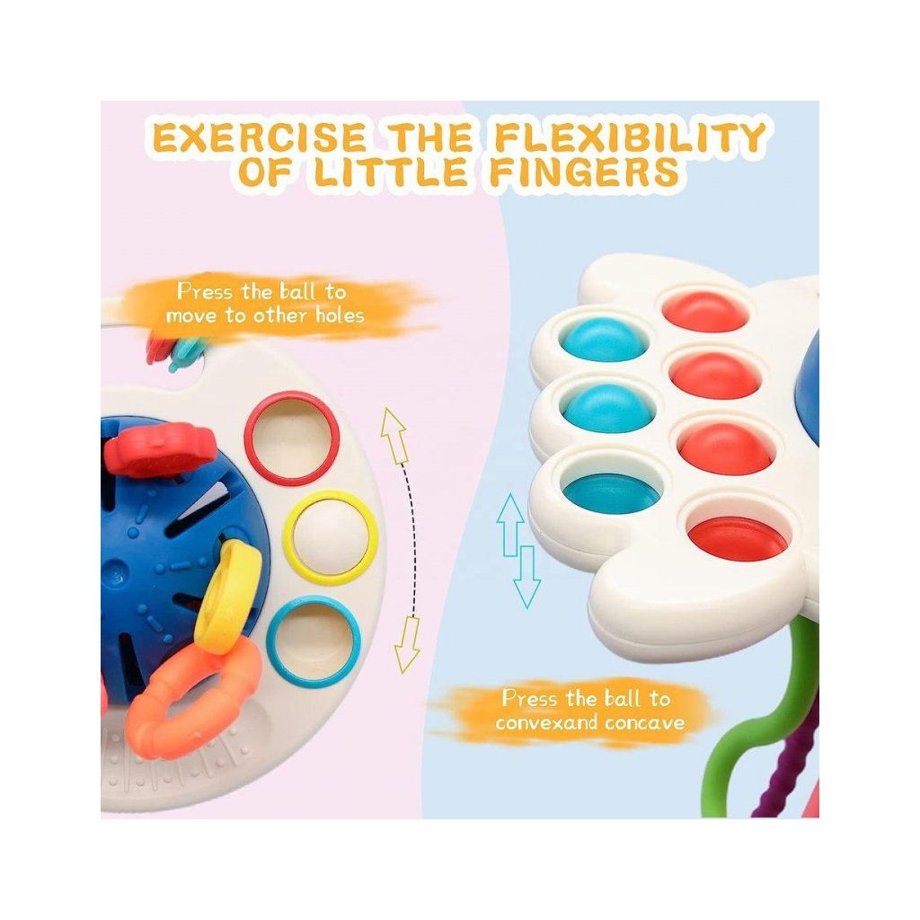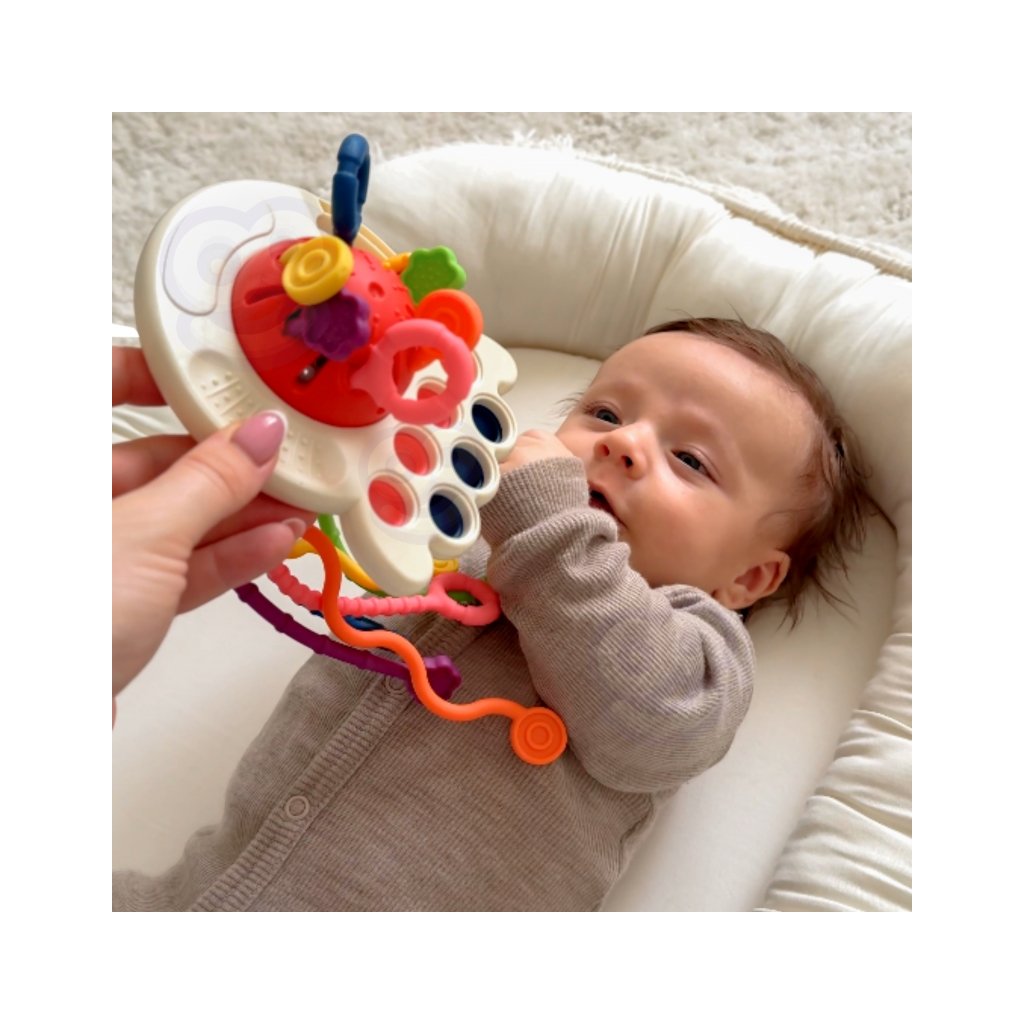 Sada obsahuje barevné, bezpečné a pro malé ručičky snadno uchopitelné provázky s různými texturami, které podporují činnost a zkoumání a zároveň poskytují úlevu při prořezávání zoubků.