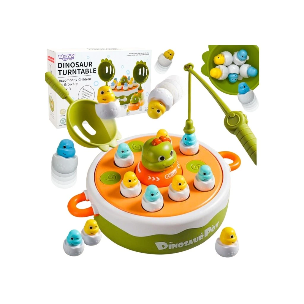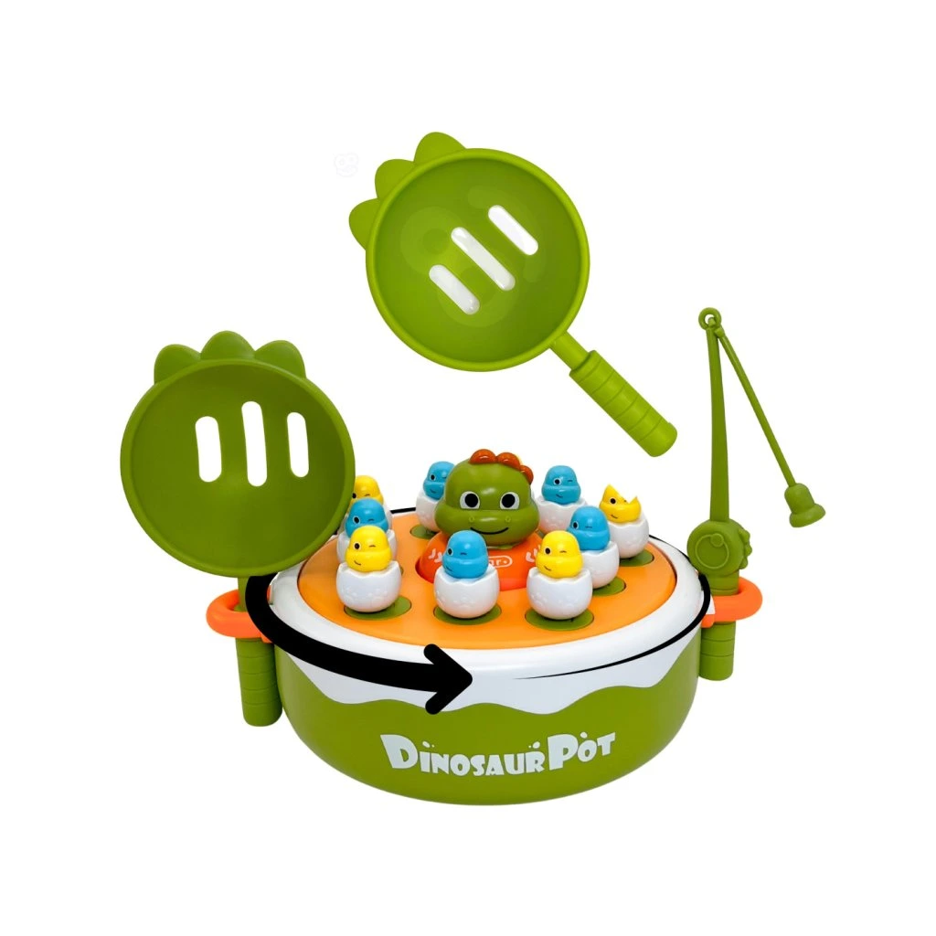 Hra obsahuje magnetickou lovící část, kde děti pomocí magnetického prutu „loví“ malé dinosauří figurky, což pomáhá trénovat přesnost a trpělivost. Další herní prvek představuje katapult, který lze využít k vystřelování drobných předmětů na cíl nebo do vyznačeného prostoru, čímž se rozvíjí koordinace a prostorové vnímání. Set také obsahuje variaci klasických jednoduchých her, které děti baví a podporují jejich logické myšlení a strategii.