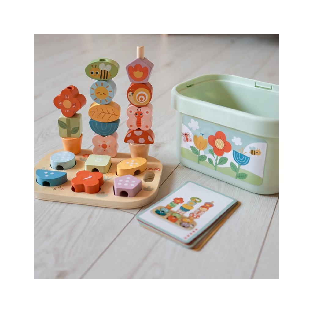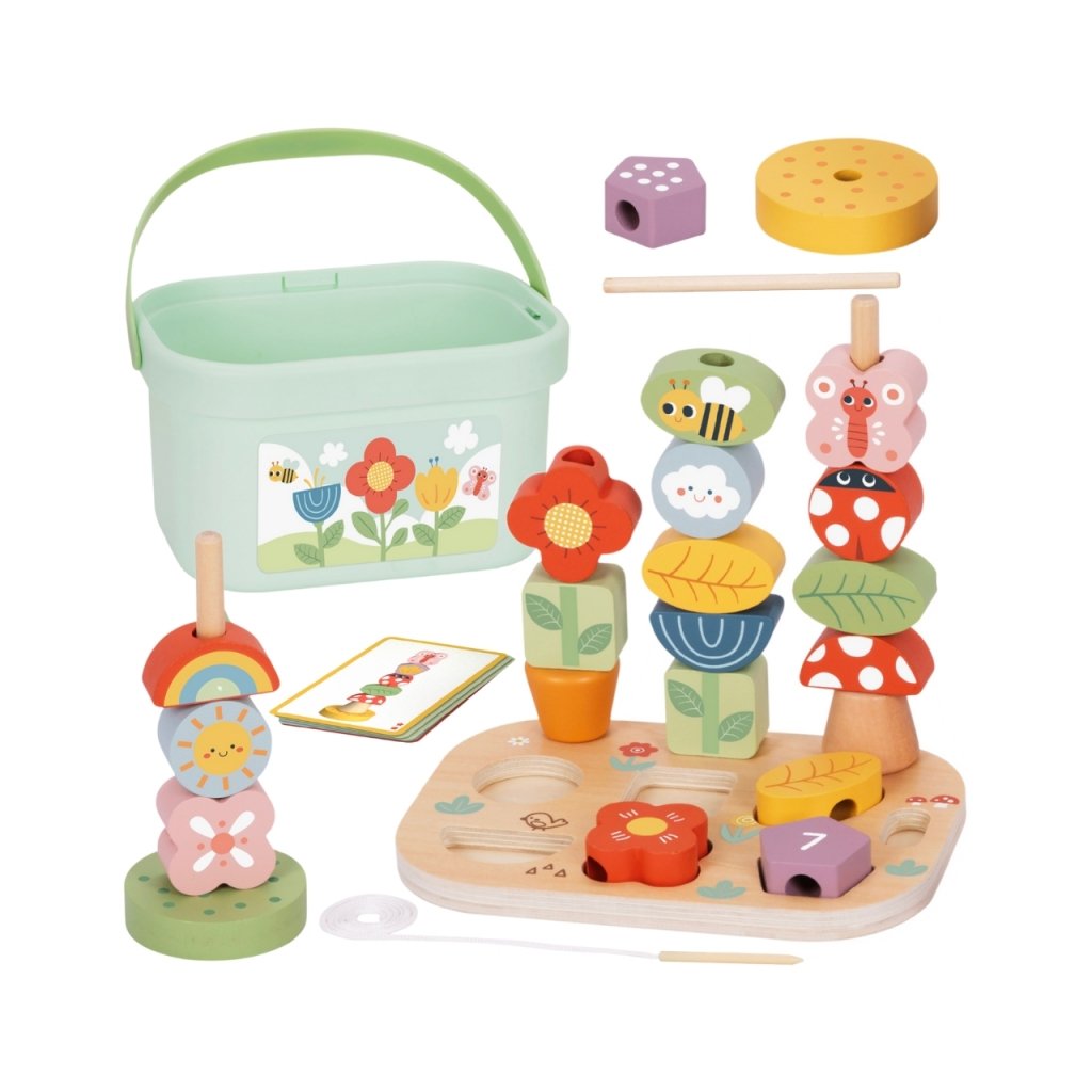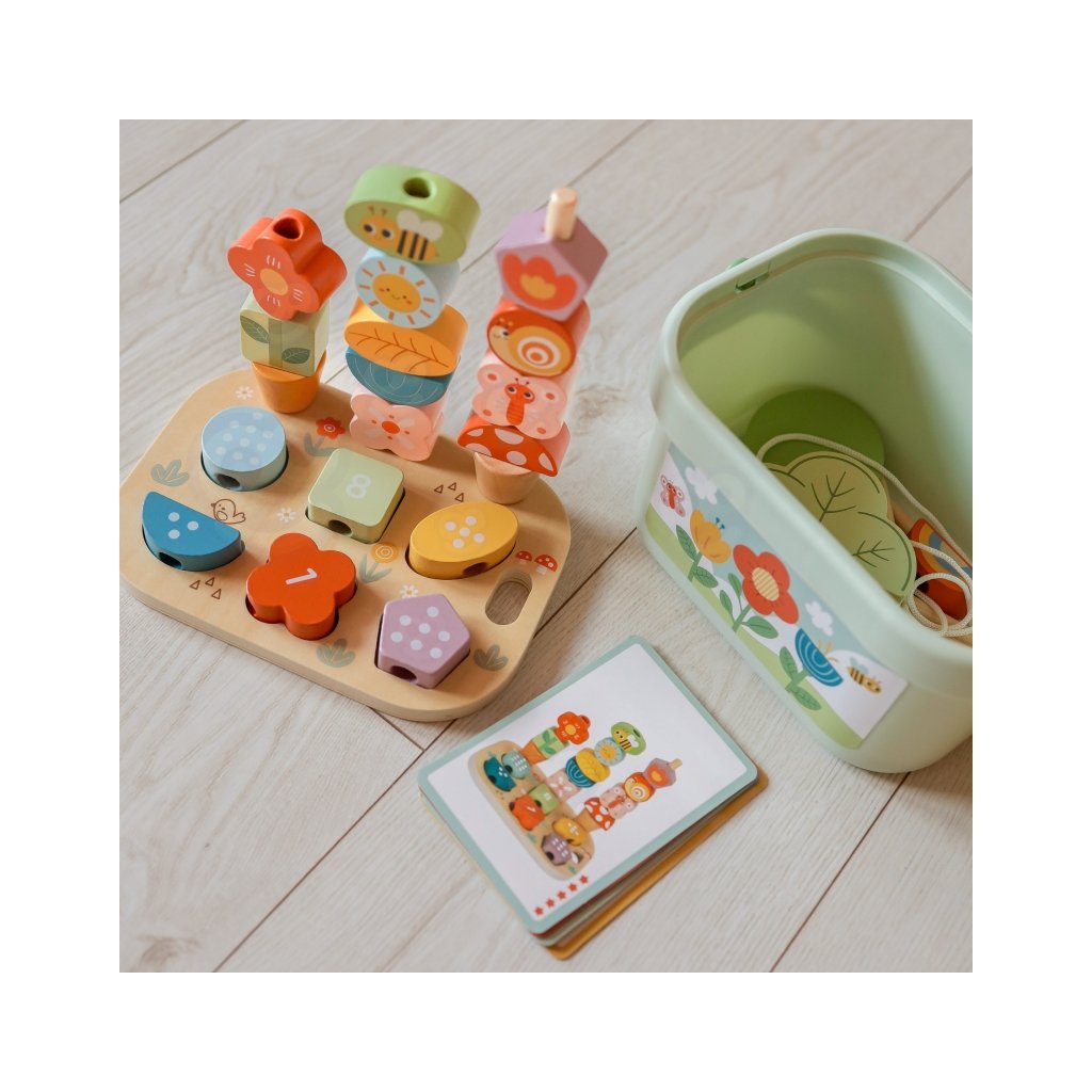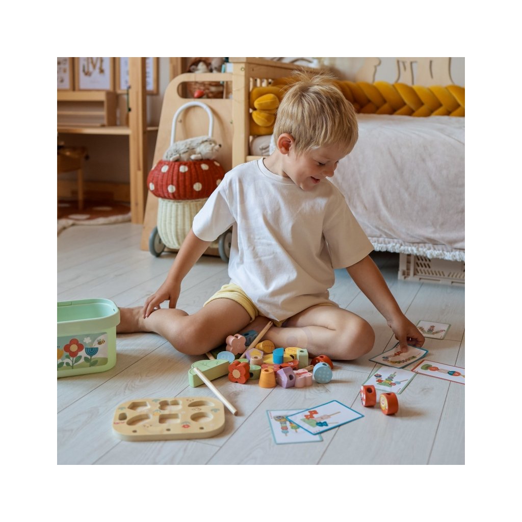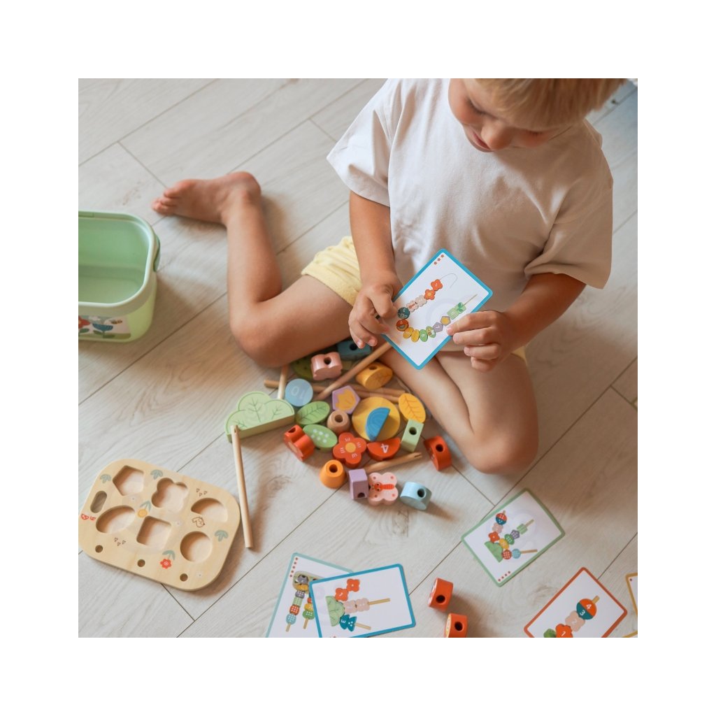 Box je vyroben z kvalitního dřeva a natřen netoxickými, bezpečnými barvami. Má rozměry přibližně 21,8 × 15,4 × 12 cm. Uvnitř se skrývá několik herních aktivit – navlékání korálků pro rozvoj jemné motoriky, třídění tvarů a barev pro trénink logického myšlení, stavění podle vzorů pro rozvoj prostorové představivosti a další úkoly podporující pozornost i tvořivost.
