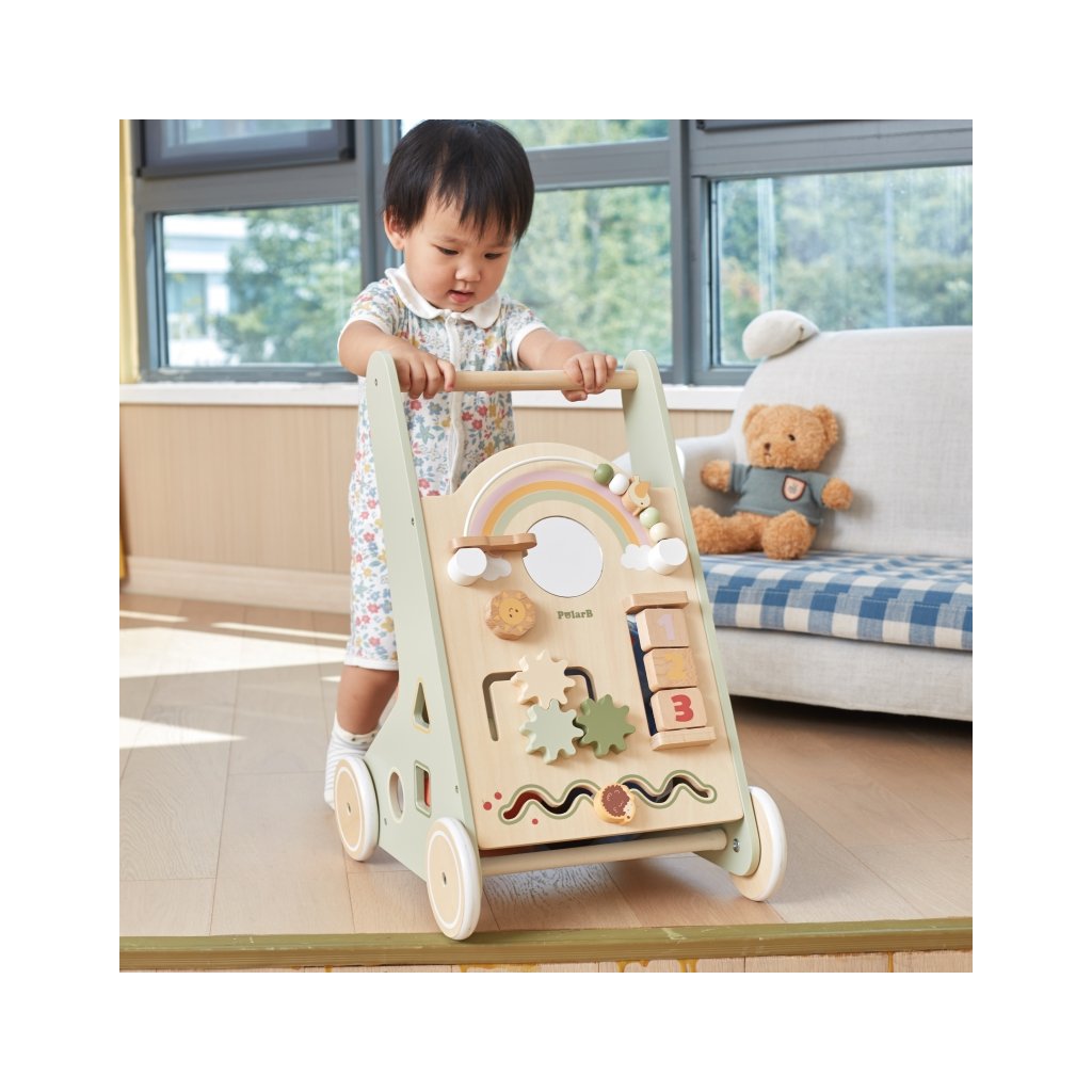 Kvalitní dřevěné chodítko v zeleném provedení nabízí nejen stabilní podporu při prvních krůčcích, ale i bohatou edukační zábavu. Přední panel je vybaven otáčecími kolotoči, korálky na drátku, posuvnou deskou, lusterkem a sekcí pro třídění tvarů, čímž stimuluje jemnou motoriku, koordinaci ruka-oko a logické myšlení.