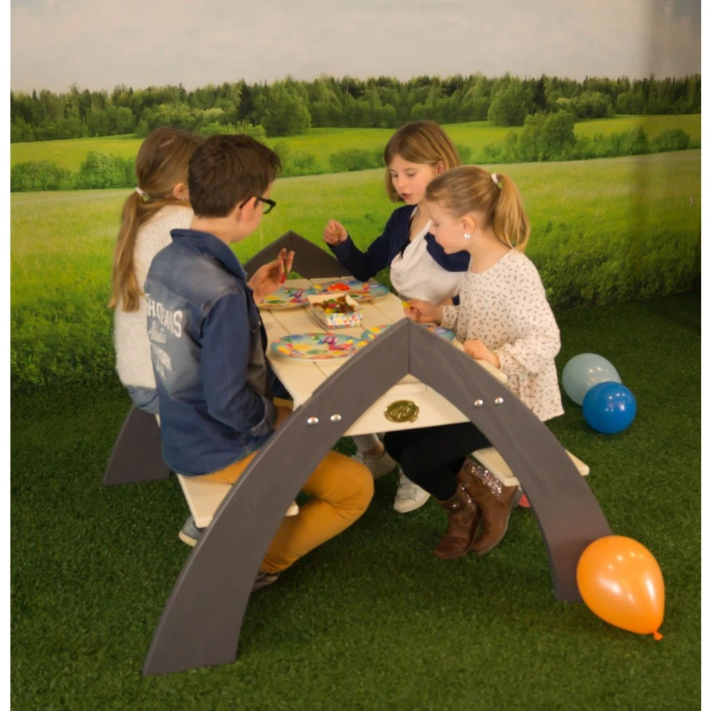 Dopřejte svým dětem vlastní místo na hraní, kreslení nebo svačinu s tímto stylovým a funkčním dětským piknikovým stolem. Stůl je vybaven lavicemi na obou stranách a barevným slunečníkem, který poskytuje příjemný stín v horkých dnech. Jeho moderní oblouková konstrukce zajišťuje stabilitu a originální vzhled, který oživí každou zahradu, terasu nebo dětský koutek.
