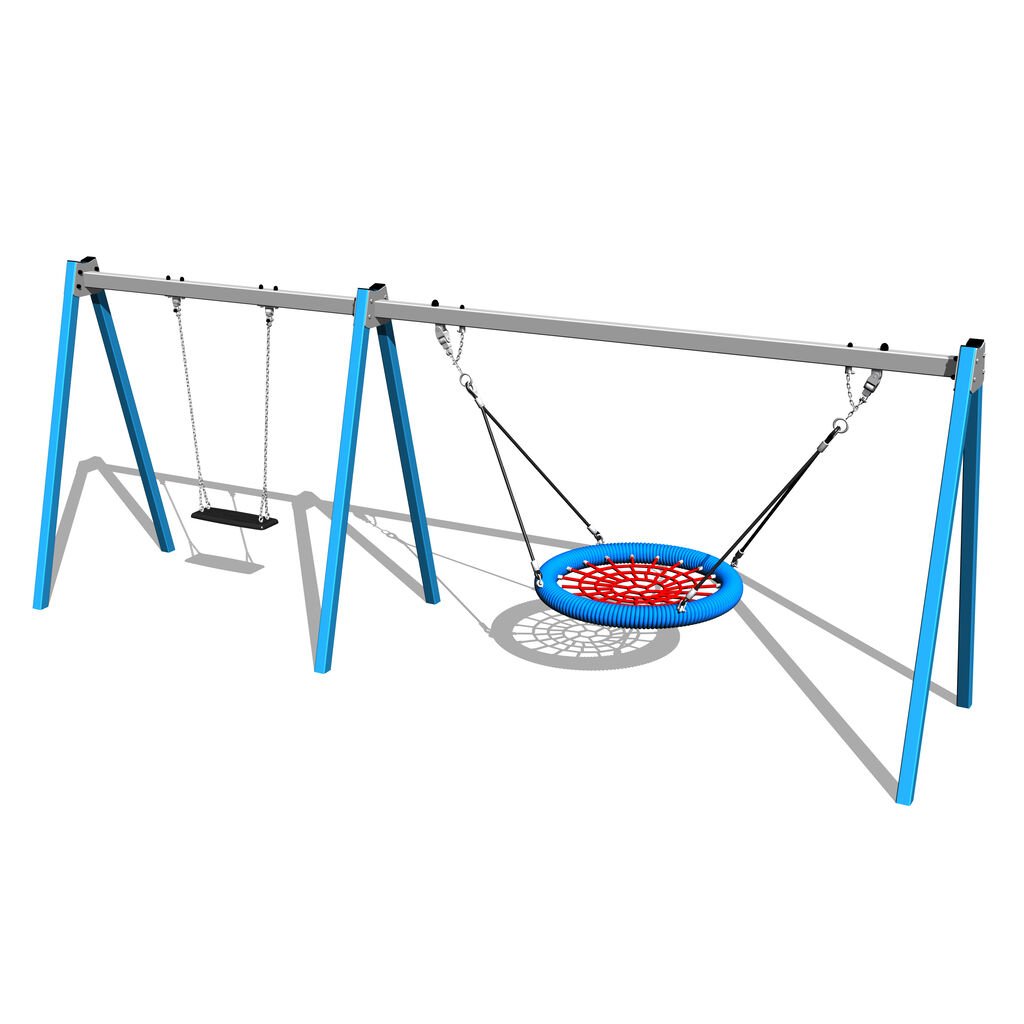 Nosná konstrukce houpačky celokovové sedák + hnízdo v.p. 1 m je vyrobena z konstrukční oceli (kovový profil 100 x 100 mm), která je proti korozi chráněna povrchovou úpravou zinkováním, čímž se docílí velmi výrazného prodloužení životnosti herního prvku a vypalovanou barvou komaxit. Tyto konstrukce jsou betonovány přímo do terénu. Veškeré další kovové prvky jsou také upravovány zinkováním a vypalovanou barvou komaxit. Ráhno houpačky je kovové a masivní, ošetřené zinkovu vrstvou proti korozi. Samotné houpačkové sedáky najdete je v souvisejícím zboží, jsou plastové s ocelovou výztuží, zavěšené na řetězech. Houpačka „Hnízdo” je vyrobena z polypropylenového lana z vysokopevnostního vlákna. Závěsná lana jsou vyrobena z materiálu herkules (16 mm lana z polypropylenu s vnitřním ocelovým jádrem). Sedáky a hnízdo mají velkou nosnost a dobře odolávají vandalům. Ke konstrukci jsou houpačkové sedáky připojené pomocí pevných houpačkových háků se silonovou vložkou pro snadné houpání. Houpačkové háky zajišťují pevné a odolné spojení. Veškerý spojovací materiál je pozinkovaný nebo nerezový.