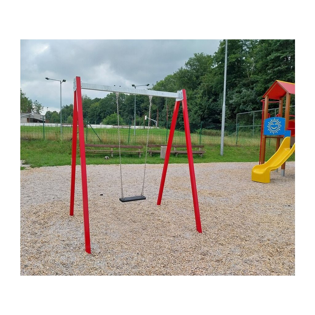 Řetězová jednohoupačka celokovová s výškou pádu 1,5 m je certifikovaná dle EN 1176 pro veřejná dětská hřiště.