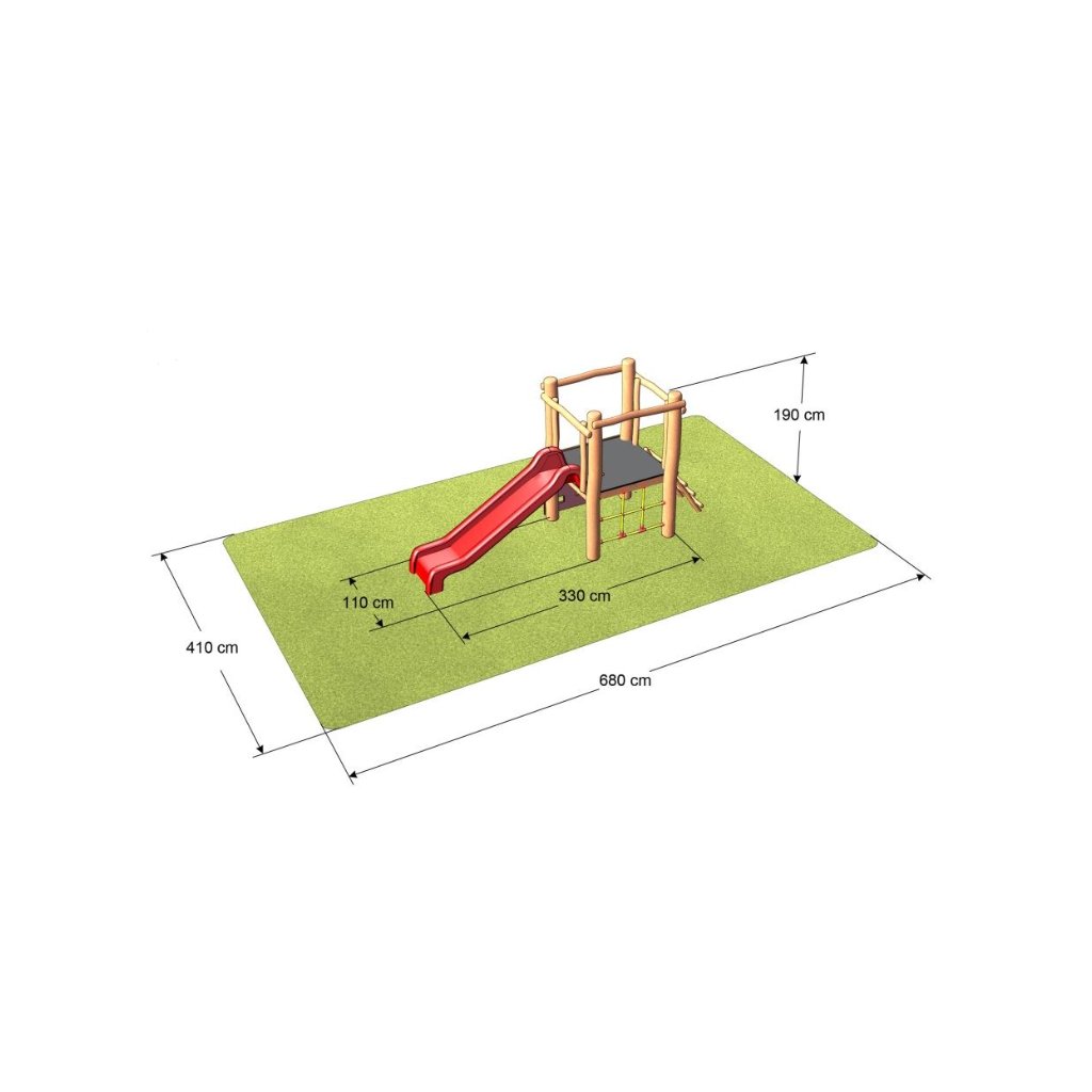 Výška volného pádu tohoto dětského hřiště je 2 m a je zde nutná dopadová plocha dle EN 1176. Proto je nezbytně nutné vytvořit tlumící povrch pro případ pádu (např. 30 cm silná vrstva písku, kačírku nebo drcené kůry).