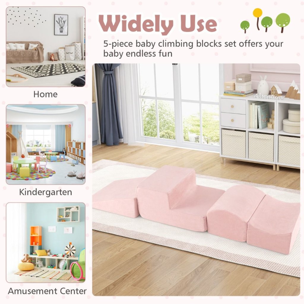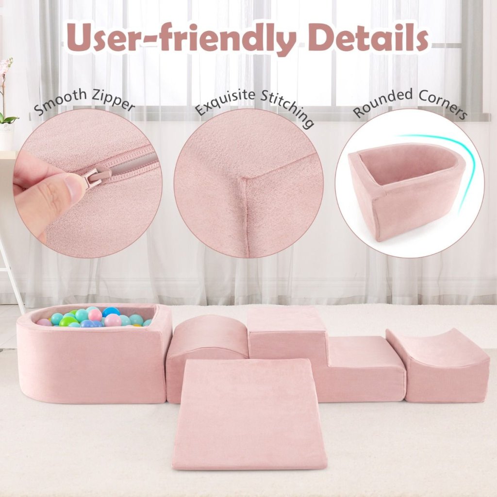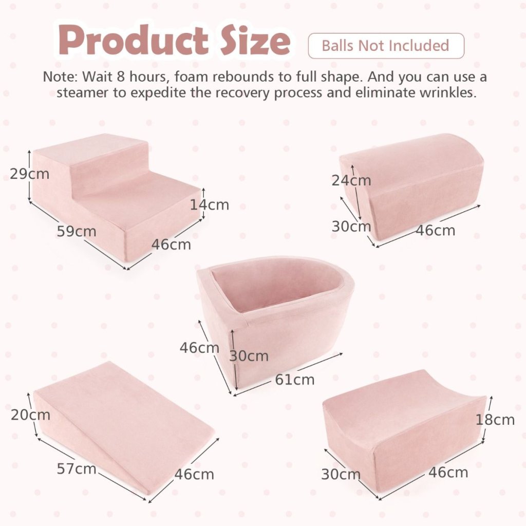 Růžová působí elegantně a jemně, takže skvěle zapadne do moderního interiéru. Rampa, schůdek, půlměsíc, tvarovaný díl a bazének na míčky tvoří univerzální herní sestavu, která podporuje kreativitu, pohyb a radost z objevování.