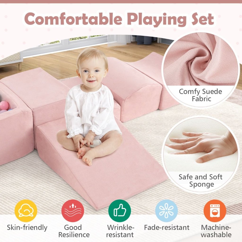 Každý díl je vyroben z měkkého, ale pevného molitanu, takže dětem nabízí bezpečné prostředí pro lezení, sklouzávání i stavění. Lehké bloky mohou malí dobrodruzi snadno přemisťovat a znovu skládat podle fantazie.