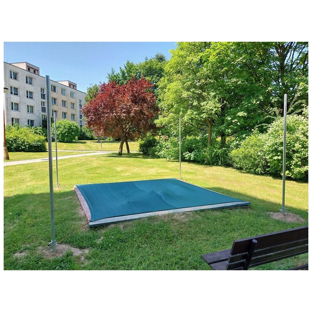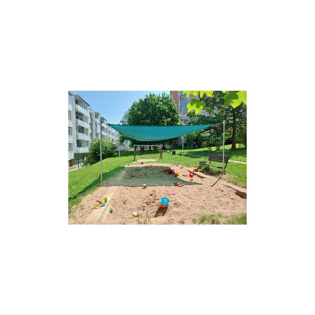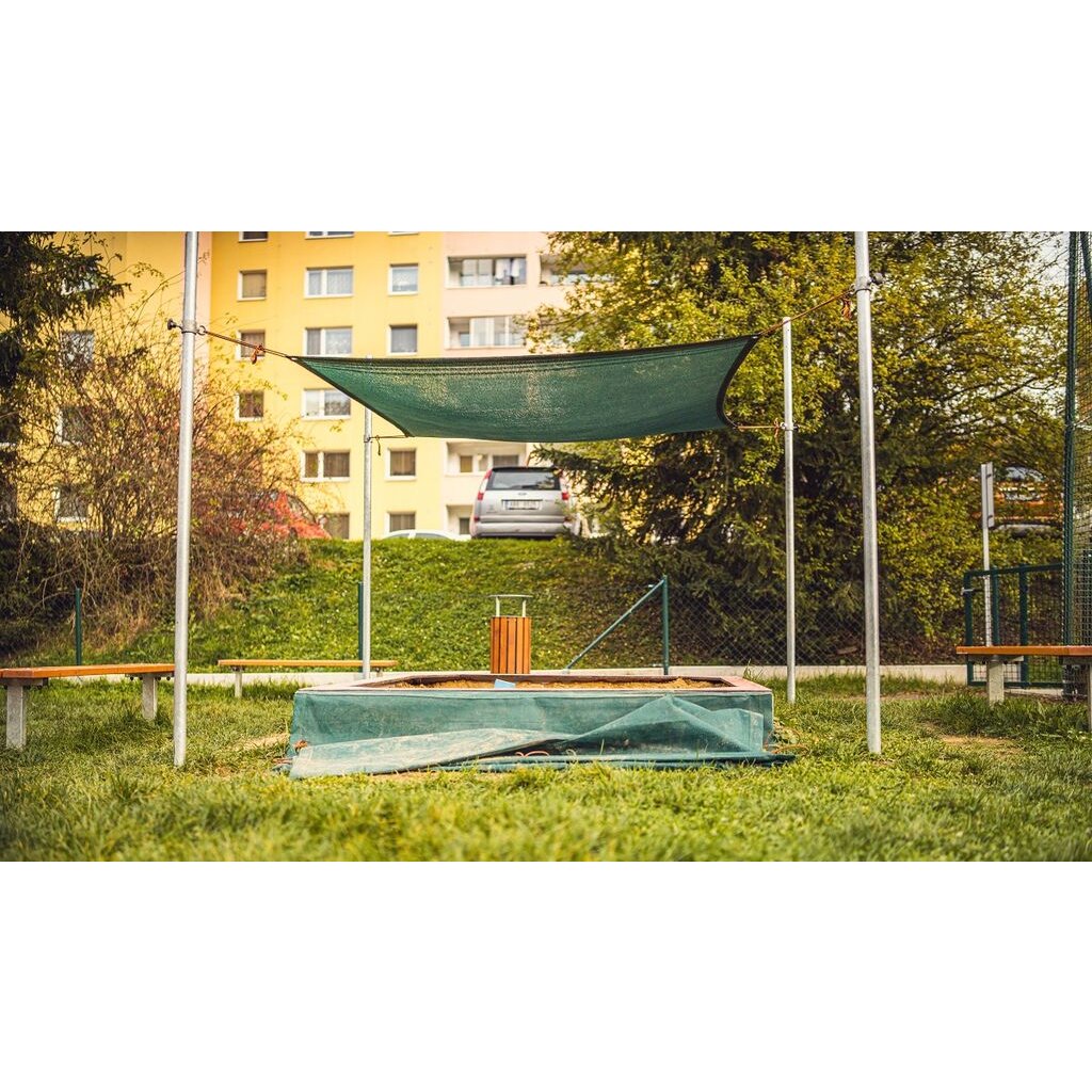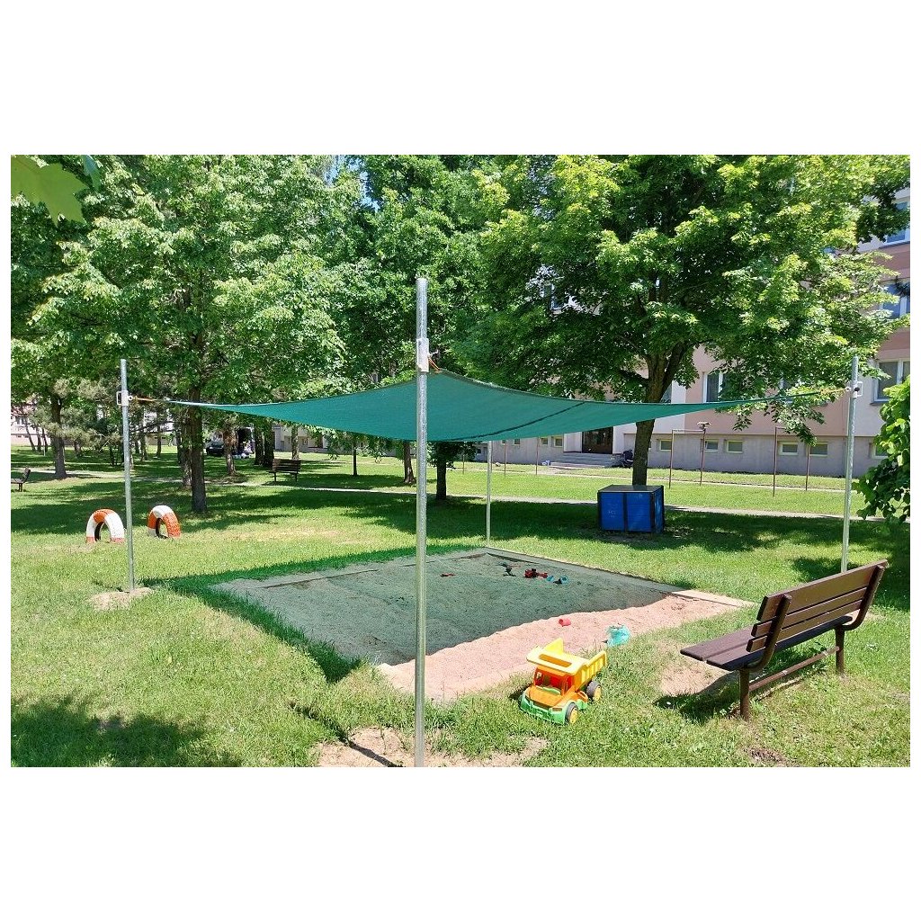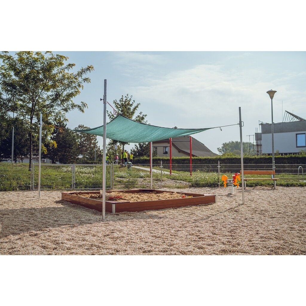 Stínění pískoviště 4x4 m posuvné je vhodné pro MŠ, obce a restaurace, hotely a všechna veřejná dětská hřiště. Vekou výhodou tohoto stínění je možnost posouvání uchycení nahoru a dolu po zabetonovaných nosných tyčích. Stínící plachta může zaroveň sloužit i jako síť proti kočkám (zabrání vnikání zvířat dó prostoru pískoviště a také se nebude písek znečišťovat listím a pod..