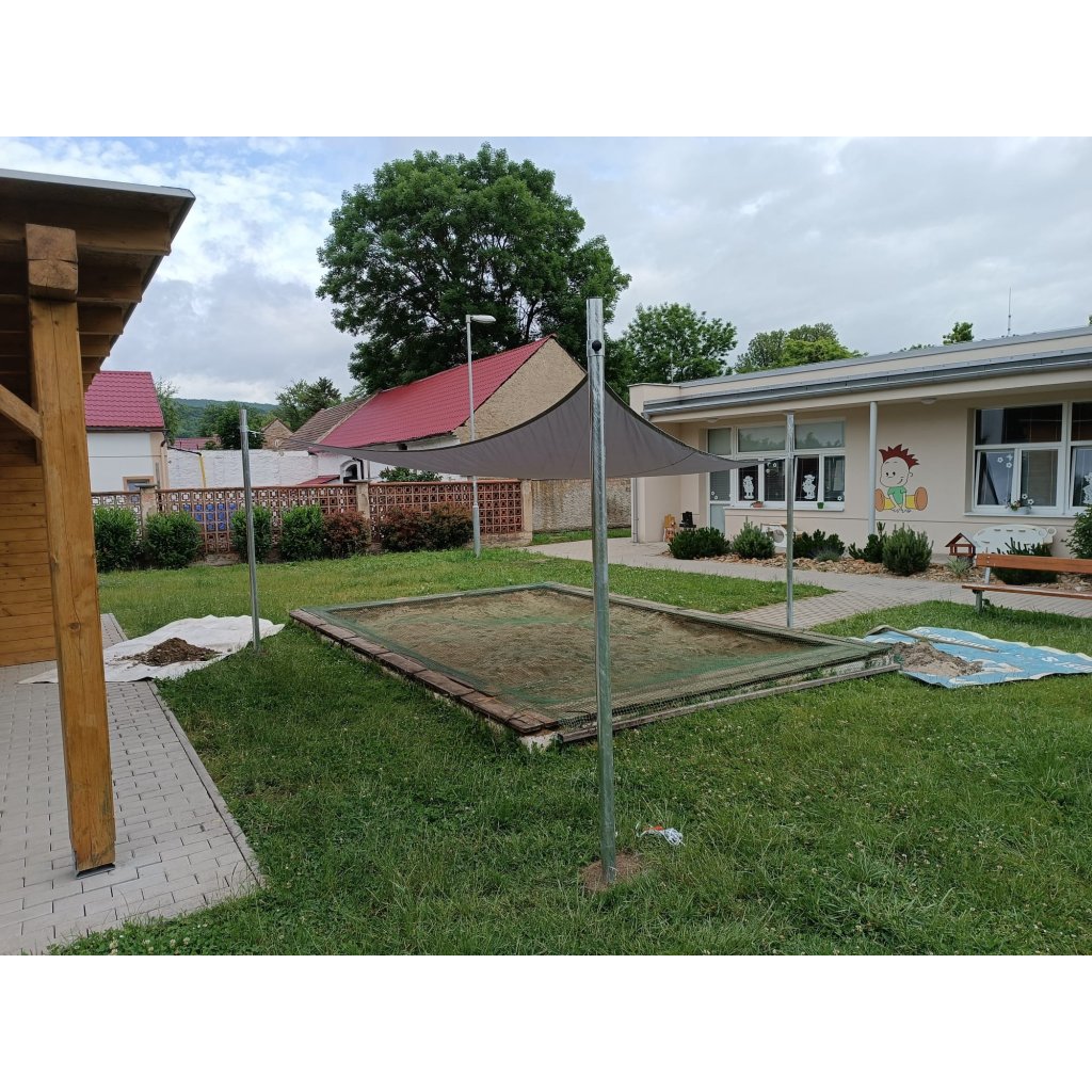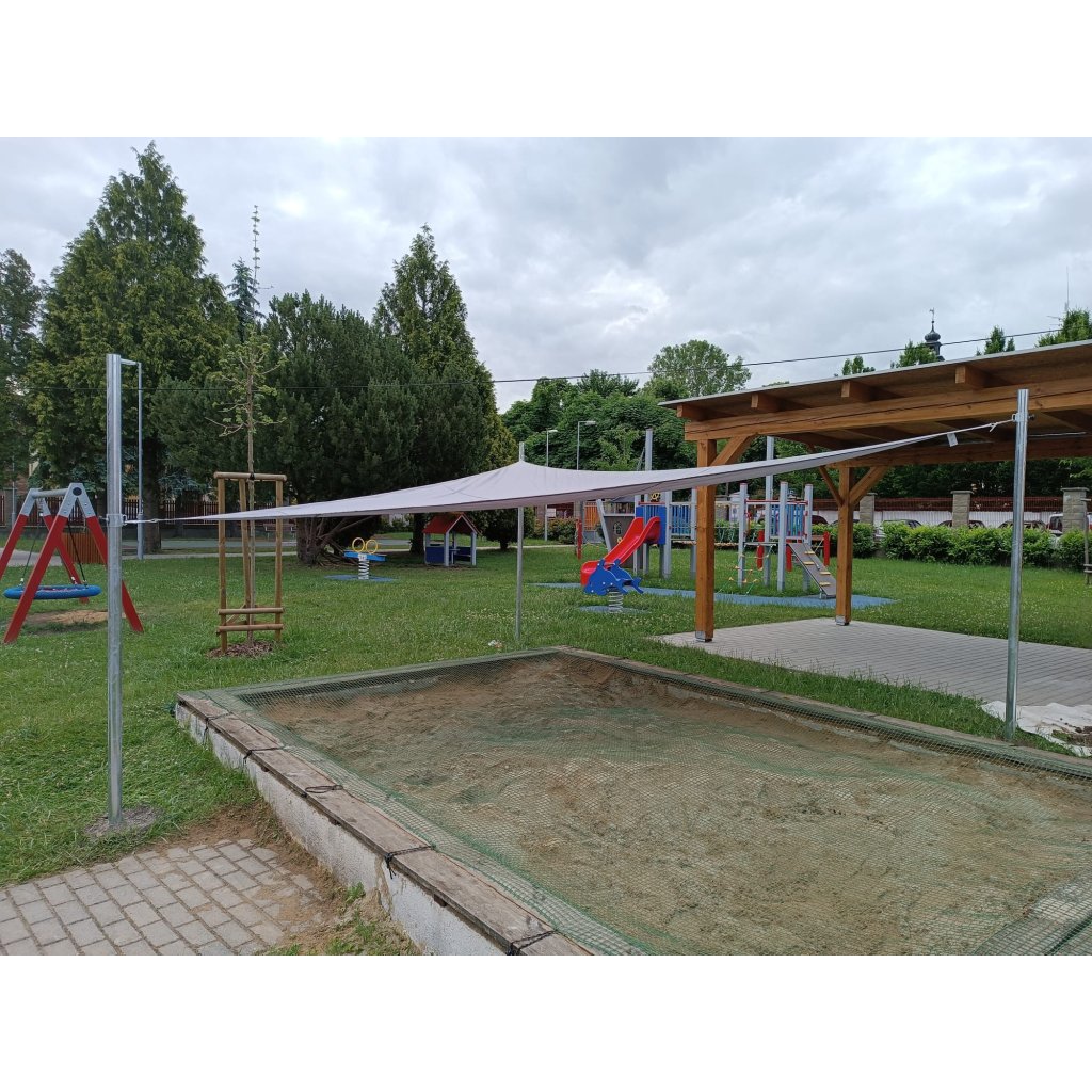 Nosná konstrukce zastínění pískoviště je vyrobena z konstrukční oceli, která je proti korozi chráněna žárovým zinkováním, čímž se docílí velmi výrazného prodloužení životnosti herního prvku. Tato konstrukce je uložena do betonového lože. Zastínění pískoviště je trojúhelníkového tvaru o rozměru 5x5 m. Vhodně zastíní část pískoviště, kde nejvíce pálí slunce, případně doporučujeme použít dva kusy různě nastavené aby se zastínilo pískoviště celé. Spojovací materiál je pozinkovaný nebo nerezový.
