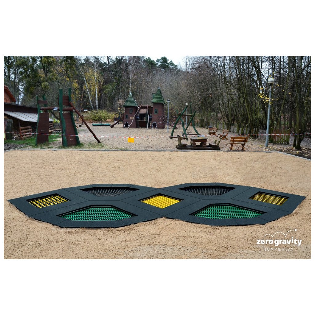 Tyto zemní trampolíny lze jednoduše skládat do různých větších tvarů, dle návrhu zákazníka a také si volit barevné kombinace jednotlivých dílů trampolíny.
